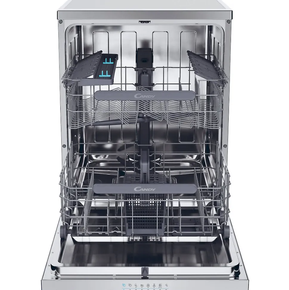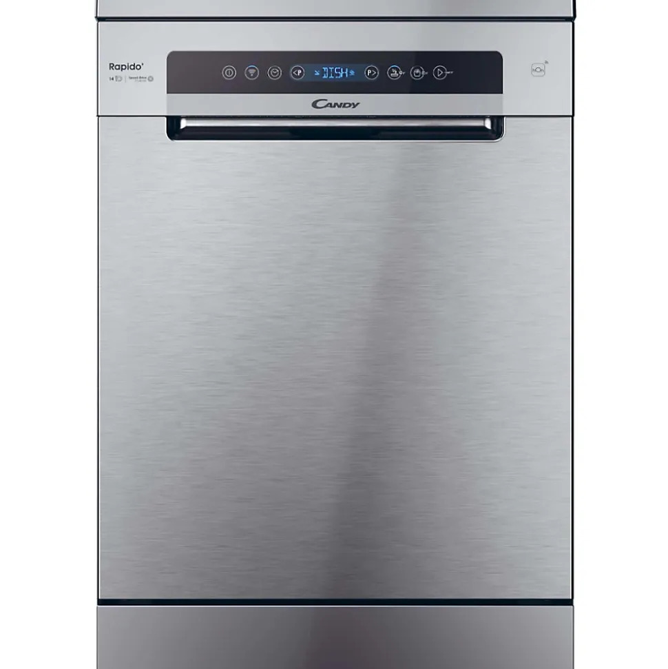 Lave-vaisselle pose libre Candy CF4E4F0X avec 14 couverts, 8 programmes, dont le rapide Wash&Dry 35 min, faible niveau sonore de 44 dB et connectivité WiFi/Bluetooth. Moteur éco et ouverture automatique de porte pour un séchage efficace.