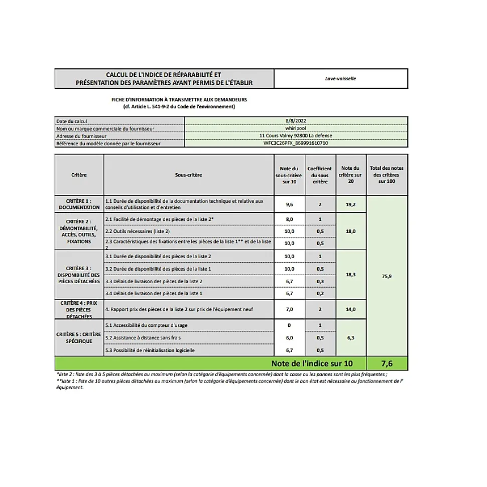 Lave-vaisselle 60cm 14 couverts inox Whirlpool – Le programmateur intelligent 6ème Sens adapte automatiquement la durée du cycle, la température mais aussi la quantité d’eau nécessaire pour un lavage impeccable.Vous économisez ainsi jusqu’à 50%* d’eau et de temps.Ce 3ème tiroir fixe s’adapte à tous vos besoins. Même les ustensiles les plus encombrants peuvent y être placés.Ce 3ème tiroir classique peut être entièrement extrait du lave-vaisselle et transporté comme un plateau pour faciliter le rangement.Avec PowerClean, placez directement plats et casseroles face aux 28 jets haute pression et éliminez les salissures les plus résistantes.PowerClean permet aussi de gagner de l’espace de lavage : jusqu’à 10 assiettes supplémentaires dans le panier inférieur.Avec PowerClean, lavez ensemble casseroles et assiettes et oubliez le prélavage à la main !Programme idéal pour les cuisines ouvertes. Ce programme vous permet de lancer votre lave-vaisselle en toute discrétion même lorsque vous recevez des invités. – Type de construction pose libreType de commande : électroniqueTop amovible : OuiNombre maximum de couverts (UE 2017/1369) : 14Puissance de raccordement : 1900Intensité : 10 ATension : 220-240 VFréquence : 50 HzIEE : 55.9Classe d’efficacité énergétique (UE 2017/1369) : EIndice de performance de lavage : 1.13Indice de performance de séchage : 1.07Consommation énergétique pour 100 cycles de programme Eco (UE 2017/1369) : 95Consommation énergétique en mode Veille (UE 2017/1369) : 0,50Consommation d’eau du programme Eco en litres par cycle (UE 2017/1369) : 9,5Émissions de bruit acoustique dans l’air (UE 2017/1369) : 46Classe d’émissions de bruit acoustique dans l’air (UE 2017/1369) : CDurée du programme (UE 2017/1369) : 3:10Température maximale d’admission d’eau : 60 °COptions de départ différé : ContinuDélai maximum de départ différé :