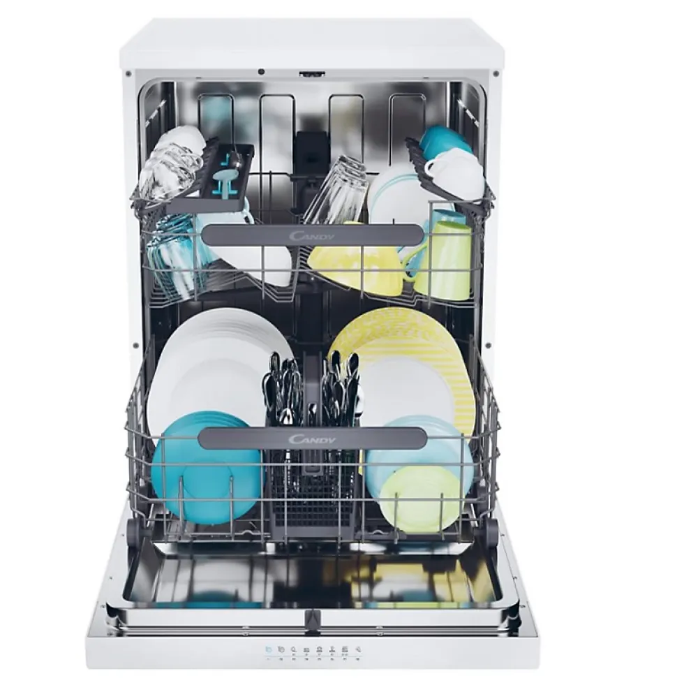 Lave-vaisselle 60cm 15 couverts 41db Candy – Lave-vaisselle connecté Rapido’ Candy CF5C1F0W doté de 8 programmes dont Wash&Dry 35 min : le plus rapide du marché avec un lavage et un séchage en seulement 35 minutes. Moteur Speed-Drive Inverter silencieux, durable et économe. Ouverture de porte automatique en fin de cycle pour un séchage rapide. Connectivité WiFi : grâce à l’application hOn, accédez en wifi à des programmes additionnels (20), recevez des notifications en fin de cycle, bénéficiez de conseils pour entretenir votre lave-vaisselle et bien plus encore ! – Type de produit : Lave-vaisselle 60 cm.Gamme : Rapido’.Nombre de couverts standard : 15.IEE : 43.5.Classe d’efficacité énergétique : C.Indice de performance de lavage : 1.130.Indice de performance de séchage : 1.070.Conso. d’énergie par cycle en programme éco (kWh) : 0.75.Conso. d’eau par cycle en programme éco (L) : 9.5.Conso. d’énergie pour 100 cycles (kWh) : 75.Durée du programme éco (h:min) : 3:58.Emissions acoustiques dans l’air dB(A) re 1 pW : 41.Classe d’émission de bruit acoustique dans l’air : B.Mode arrêt (W) : 0.50.Mode veille (W) : 1.00.Démarrage différé (W) : 4.00.Mode veille avec maintien de la connexion au réseau (W) : 2.00.Lave-vaisselle connecté : Oui.Type de connectivité : Wi-Fi + Bluetooth.Ouverture automatique de la porte : Oui.Programmateur électronique : Oui.Nbre de programmes : 8.Nbre températures : 5.Programme Prélavage : Oui.Programme Intensif : Oui.Programme Eco : Oui.Programmes spéciaux : Universel, Rapide 35 min, Rapide 59 min, Verre, Lavage auto, 20 programme supplémentaires.Départ différé : Oui.Type de départ différé : 1-23 h.Touches spéciales : Option tablettes, Option rapide.Ecran : Oui.Type d’affichage : Digit.Affichage du temps restant : Oui.Voyant niveau de sel : Oui.Voyant niveau liquide de rinçage