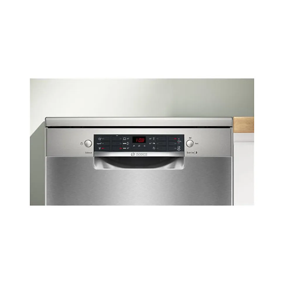 Le lave-vaisselle BOSCH SER2 SMS26AI01F, avec son design en acier, combine efficacité et style. Capable de laver 12 couverts avec un niveau sonore de 48 dB, il est aussi économe avec une consommation de 9,5 litres d’eau par cycle. Ses 6 programmes et sa cuve en Polinox/acier inox assurent une utilisation facile et durable. Dimensions : H 84,50 cm x L 60,00 cm x P 60,00 cm.