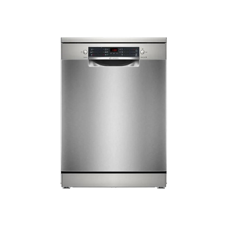 Lave‑vaisselle Bosch 60 cm SMS26AI01F, 12 couverts, moteur EcoSilence Drive, 6 programmes (Intensif, Auto, Eco, Verre, 1h, Prélavage), options VarioSpeed Plus, Hygiène Plus et Séchage Extra. AquaStop, échangeur thermique, panier supérieur RackMatic réglable 3 positions, triple filtre autonettoyant. Consommation : 9,5 L/cycle, 0,92 kWh/cycle (92 kWh/100 cycles). Niveau sonore 48 dB(A). Finition inox anti-traces. Garantie 2 ans.