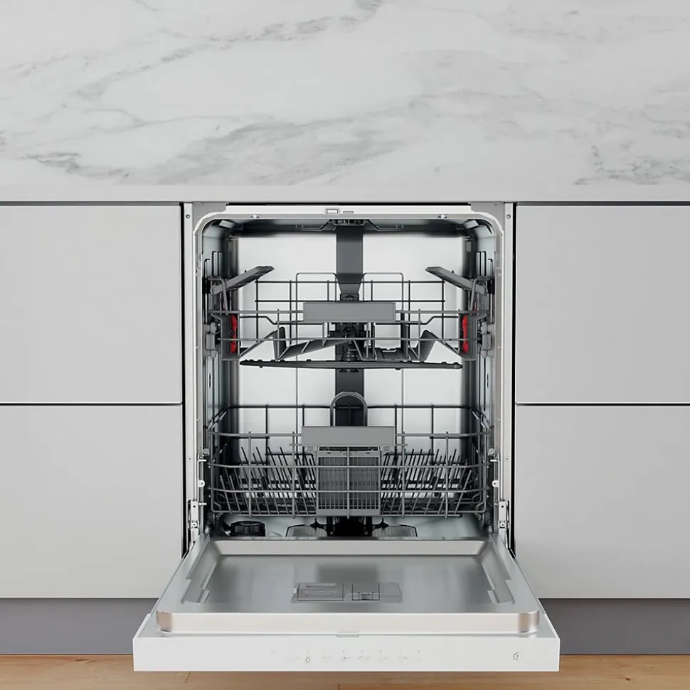 Lave-vaisselle encastrable Whirlpool 14 couverts 59cm de classe énergétique A++ avec 8 programmes, technologie 6ème Sens, départ différé, et filtration haute performance pour une propreté impeccable et une intégration discrète.