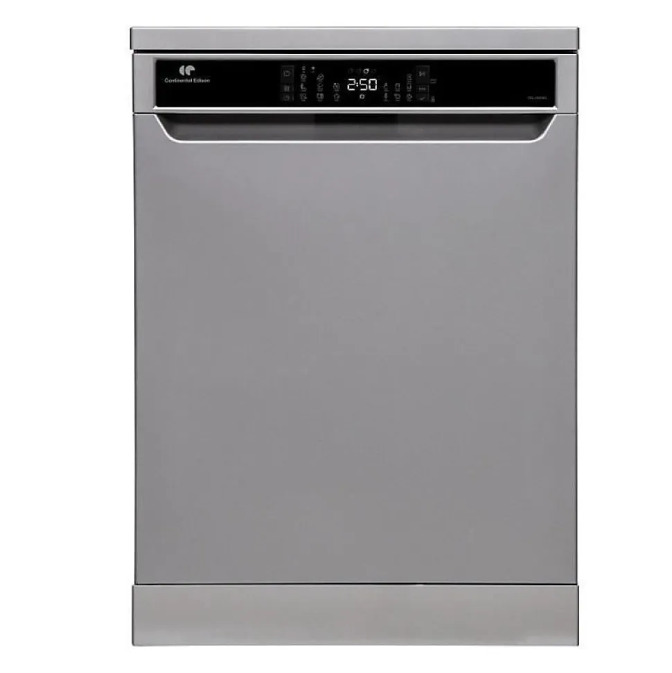 Lave-vaisselle pose libre CONTINENTAL EDISON 15 couverts (59,8 cm) – Moteur à induction silencieux (39 dB), classe énergétique D, 8 programmes, départ différé 1–24 h, panier supérieur réglable, tiroir à couverts et mode séchage turbo.