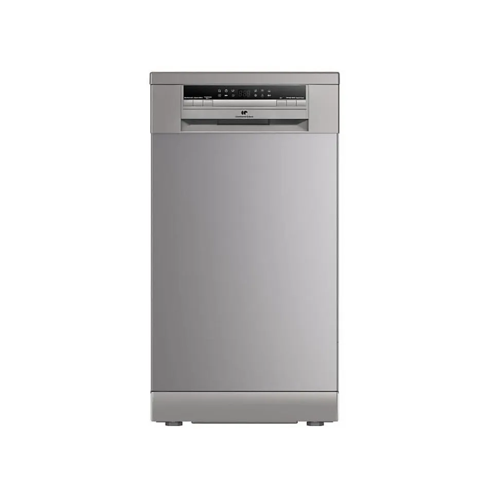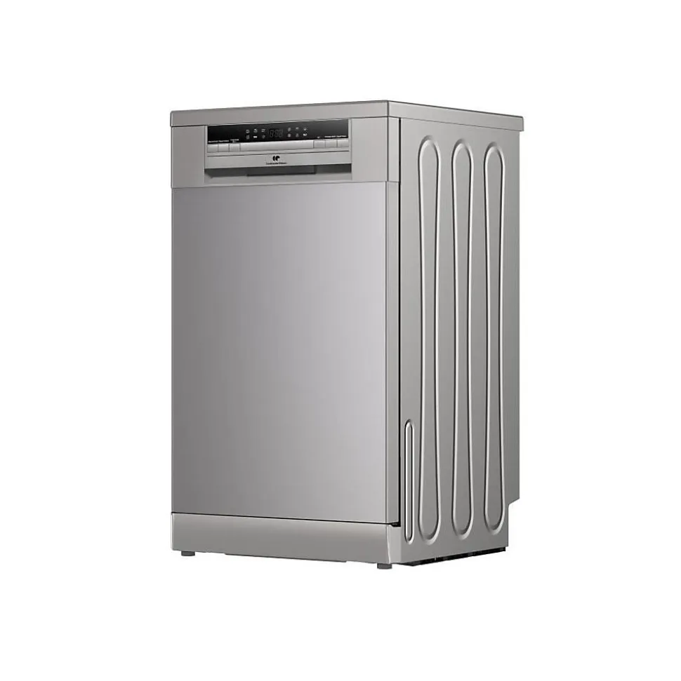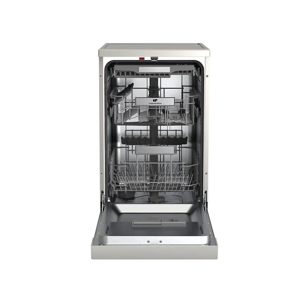 Lave-vaisselle pose libre compact 45 cm Continental Edison CELV1145S, 11 couverts, design silver, fonctionnement discret (45 dB), consommation d’eau 10 L/cycle et économie énergétique (classe D). Équipé de 6 programmes, tiroir à couverts, départ différé, adoucisseur intégré, affichage digital et sécurités anti-fuite et enfant.