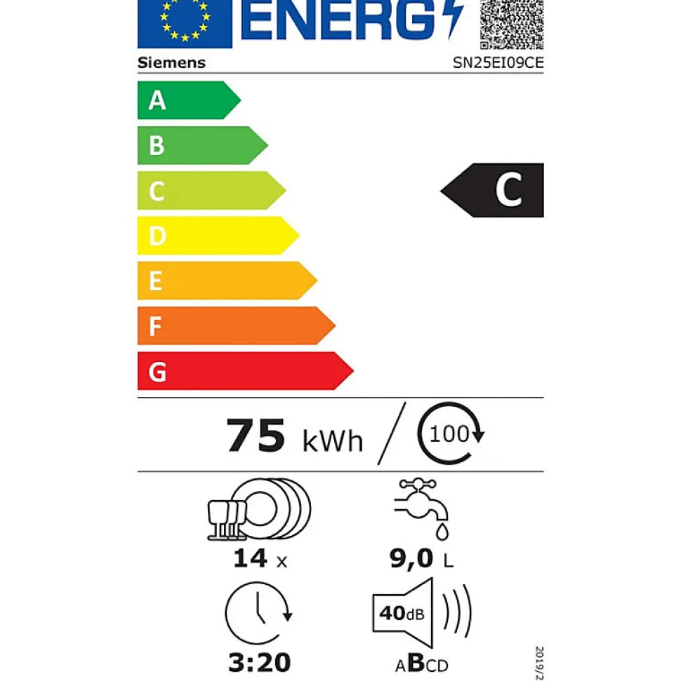 Lave-vaisselle Siemens SN25EI09CE en pose libre, capacité 14 couverts, classé énergie C, avec 8 programmes et fonctions avancées telles que varioSpeed Plus, rackMatic et Home Connect. Dimensions 60 x 84.5 x 60 cm, silencieux (40 dB), consommation eau 9 L par cycle, finition inox, poids 56,5 kg.