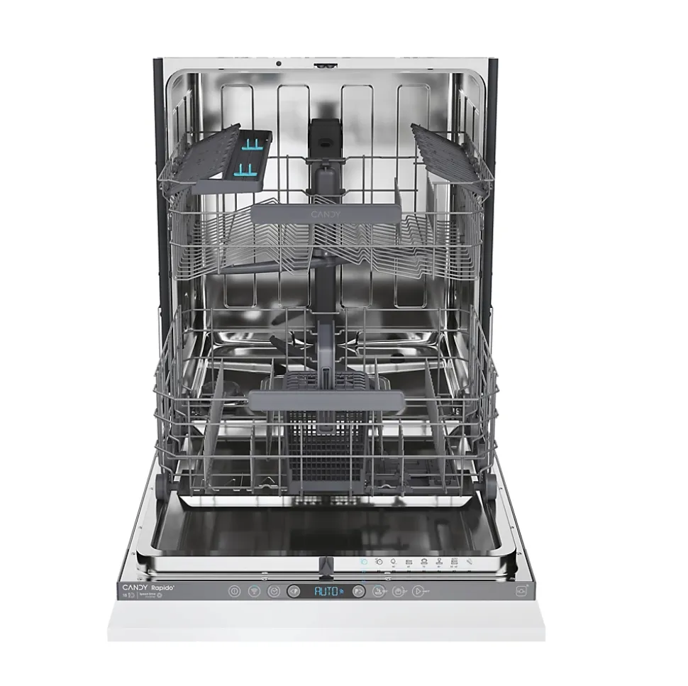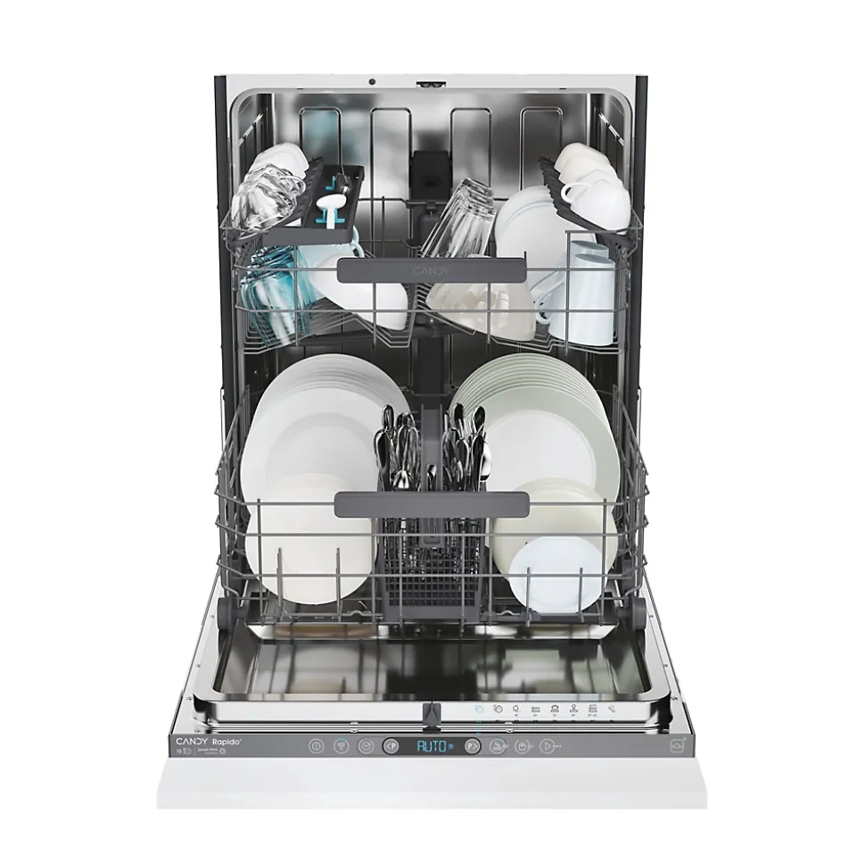 Lave-vaisselle tout intégrable 15 couverts 44 db tout intégrable Candy – Lave-vaisselle Tout intégrable Candy CS5C4F0A1 avec Maxi-cuve. Les lave-vaisselle Candy Rapidò sont dotés de la cuve la plus spacieuse du marché. Grâce à cela, vous pourrez même laver les articles les plus volumineux tels que les lèchefrites, les planches à découper ou encore les louches. Grâce au système de glissières, notre lave-vaisselle est conçu pour une adaptation parfaite à tout meuble de cuisine. La porte d’habillage peut atteindre 80 cm de hauteur et la plinthe peut être réduite jusqu’à 2 cm. Le témoin lumineux du FloorLight est projeté sur le sol, en dessous de la porte, pour vous indiquer qu’un cycle est en cours. Une fois ce dernier terminé, le témoin disparaît pour vous prévenir que la vaisselle peut être retirée sans danger. Grâce à l’application hOn, accédez à des conseils personnalisés, des programmes spéciaux et contrôlez à distance votre lave-vaisselle pour gagner du temps et rendre votre expérience simple et facile. De plus, grâce aux fonctions Snap&Wash & Dishplacer, l’application détermine le cycle de lavage le plus adapté à votre vaisselle en prenant simplement une photo de votre panier chargé ou encore vous pouvez obtenir des conseils pour optimiser les chargements. – Type de produit : Lave-vaisselle Tout intégrable.Nombre de couverts : 15.Niveau sonore : 44 dB.Conso élec. : 75 kWh/100 cycles.Conso eau : 10,9 L/cycle de référence.Tiroir à couverts : Non.Matériau de la cuve : Inox.Voyant de rinçage : Oui.Voyant de sel : Oui.Durée Prog. ECO : 237 min.Départ différé : Jusqu’à 23 heures.Afficheur Temps Restant : Non.Connecté : Oui.Ouv. porte auto Fin de cycle : Oui.Label énergie : C.Catégorie sonore : B.Indice de réparabilité : 8,7/10.Le + produit : Porte à glissières.9 programmes dont Auto et Wash&Dry 35 min 60°.Options : Express et Tablettes.Panier supérieur réglable en