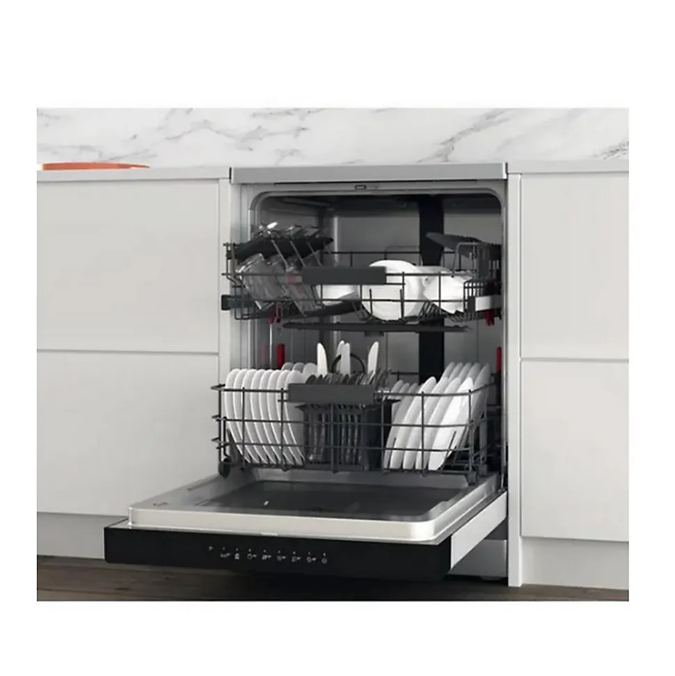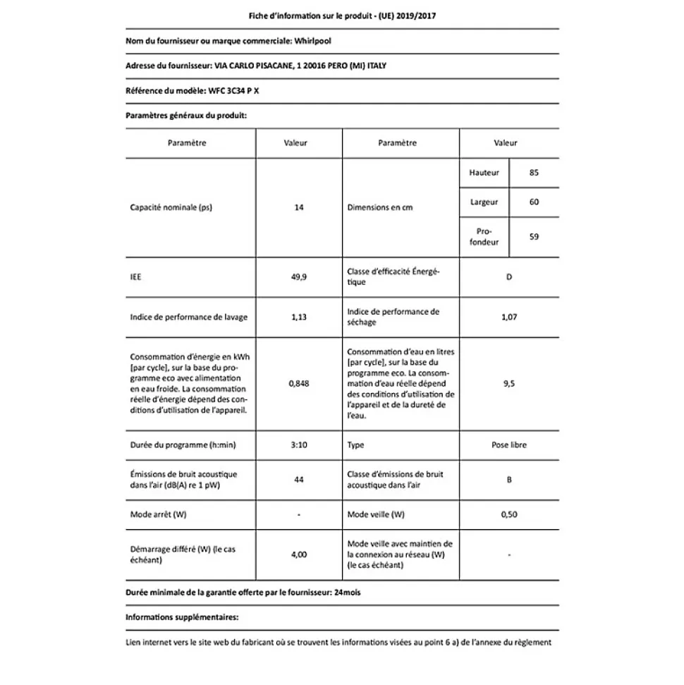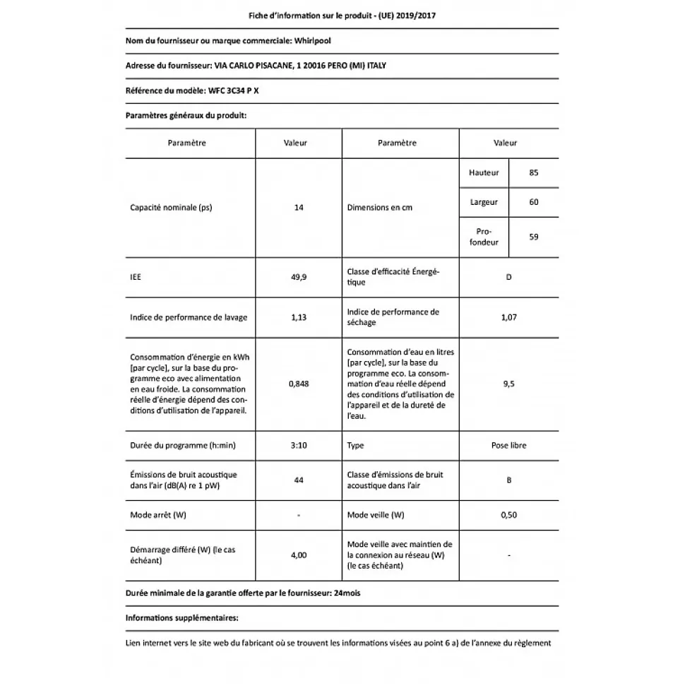 Lave-vaisselle Whirlpool WFC3C34PX, série Supreme Clean, 60 cm – Ce modèle affiche une capacité de 14 couverts, idéale pour les familles – Il propose 8 programmes dont Eco, Intensif et un mode Silence à 43 dB, parfait pour un lavage discret, même la nuit – Le programme intelligent 6ème Sens ajuste automatiquement température, durée et consommation d’eau selon le niveau de salissure – L’option PowerClean Pro libère de l’espace dans le panier inférieur grâce à 28 jets haute pression ciblés pour un lavage impeccable – La technologie Natural Dry permet une ouverture automatique de la porte en fin de cycle pour un séchage naturel, sans énergie superflue – Le départ différé 24 h et l’affichage digital apportent un vrai confort d’usage – Côté agencement, le panier supérieur est réglable en hauteur, amovible, avec 4 flaps escamotables – Le panier inférieur dispose d’un panier à couverts amovible et de 2 zones à picots rabattables – Le moteur à induction assure performance et silence, tandis que la cuve en inox garantit longévité – Une sécurité anti-débordement est également intégrée – Finition inox avec bandeau noir. Caractéristiques Nombre de couverts 14 Niveau sonore 44 dB Conso eau 9,5 L / cycle de référence Conso élec. 85 kWh / 100 cycles Durée Prog. ECO 190 min Labels et points clés Label énergie D Catégorie sonore B Indice de réparabilité 7,6 / 10 Le + produit Séchage Natural Dry Disponibilité des pièces détachées 10 ans (donnée constructeur) Ouv. porte auto Fin de cycle oui Tiroir à couverts non Matériau de la cuve inox Voyant de rinçage oui Voyant de sel oui Départ différé jusqu’à 24 heures Afficheur Temps Restant oui Connecté non Couleur du bandeau inox Top amovible oui Dimensions (LxHxP) 60 x 85 x 59 cm Poids net 47 Kg Lieu de fabrication Pologne