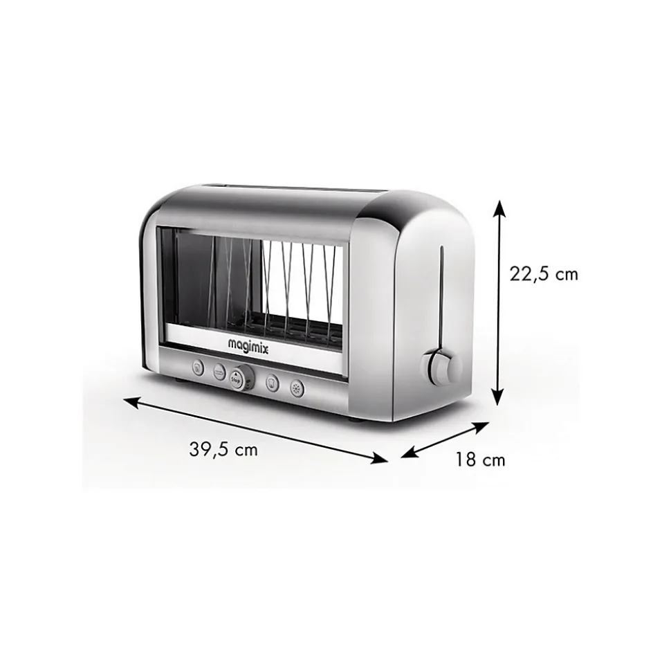 Magimix invente le 1er toaster à vision panoramiquepour des toasts exactement comme vous les aimez.Puissance 1450 watts, contrôle visuel du painpour des toasts parfaits – vision panoramique 4 tubes quartz – Remontée extra-haute, porte double paroi isolante.Fonctions réchauffage, décongélation et baguette (grille 1 seul côté)Collection : Grille-Pain – Toasters Matière : Acier inoxydable (inox) Couleur : Argent / Métallique Longueur : 40.00 cm Largeur : 18.00 cm Hauteur : 23.00 cm
