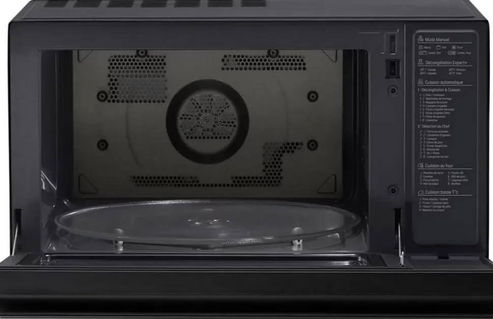 Micro-ondes gril quartz + convection 1850 w – 5 niveaux de puissance – commandes tactiles intégrées à la porte – technologie smart inverter microwave : four multifonction (des programmes sur mesure grâce à une gestion précise de la température), puissance micro-ondes exceptionnelle, décongélation rapide et en douceur, délivre la chaleur en profondeur dans l’aliment – technologie lightwave : véritable respect de l’aliment, maintien de l’humidité et de la saveur des ingrédients, préservation des vitamines et minéraux – horloge – eclairage led – plateau tournant ø 36 cm – cavité easyclean : le revêtement easyclean est imperméable et antibactérien, empêchant les graisses de pénétrer et de s’incruster : la cavité se nettoie facilement en un simple coup d’éponge – sécurité enfants – porte abattante avec poignée intégrée – bouton push pull rétractable – finition noir.