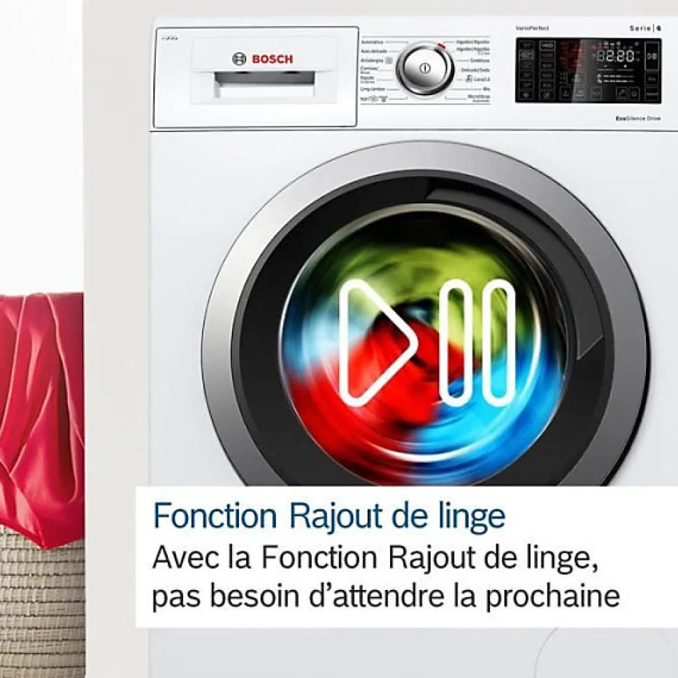 Lave-linge frontal Bosch Série 6 9 kg WGG244F1FR avec i-DOS, moteur à induction EcoSilence Drive, ActiveWater Plus, essorage 1400 trs/min et grand écran LED pour des cycles précis et rapides.