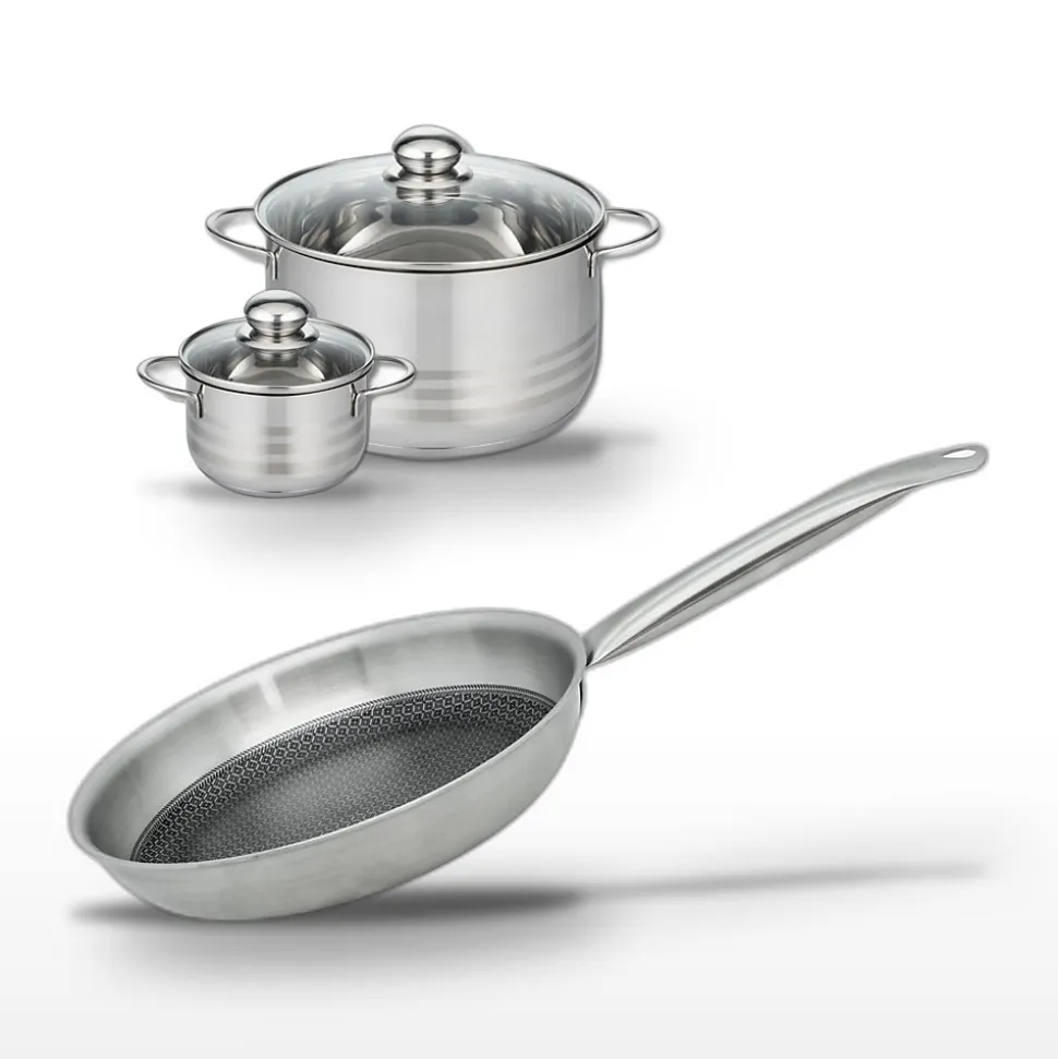 DESCRIPTION : DESCRIPTION : Cet ensemble comprend une poêle 28 cm et deux faitouts 12/24 cm de la collection Elo Relief Solution, offrant une cuisson homogène et des matériaux de haute qualité.PETIT + : PETIT + : Le design moderne et fonctionnel avec bord verseur et manche creux, ainsi que l’échelle de mesure intégrée dans les faitouts pour une utilisation simplifiée.COMPOSITION : COMPOSITION : Acier inoxydable 18/10 avec revêtement antiadhésif ELODUR Select, aluminium et acier, garantissant robustesse et légèreté.DIMENSIONS : DIMENSIONS : Poêle Ø 28 cm, Faitout Ø 24 cm, Faitout Ø 12 cm, adaptés pour des préparations de 1 à 5 personnes.UTILISATION : UTILISATION : Compatible tous feux, y compris induction. Passe au four jusqu’à 240°C (180°C avec couvercle).ENTRETIEN : ENTRETIEN : Facile à nettoyer, compatible lave-vaisselle. Utilisez une éponge douce pour préserver le revêtement antiadhésif.Cet ensemble Elo Relief Solution est conçu pour répondre aux besoins des professionnels et amateurs de cuisine exigeants. La poêle de 28 cm, en acier inoxydable 18/10, est dotée d’un revêtement antiadhésif ELODUR Select sans PFAS, garantissant une cuisson optimale et sans accroche. Les faitouts de 12 et 24 cm offrent une grande polyvalence grâce à leur base spéciale économie d’énergie, assurant une répartition homogène de la chaleur sur tous types de feux, y compris l’induction. Ces ustensiles sont également résistants à la chaleur jusqu’à 240°C (180°C avec couvercle), permettant une utilisation au four pour des recettes variées. Le design moderne, avec bord verseur et échelle de mesure intégrée, facilite le quotidien en cuisine. Faciles à entretenir, ces pièces passent au lave-vaisselle, assurant ainsi une longévité et une praticité maximales. Ce lot est un choix judicieux pour ceux qui recherchent des u…