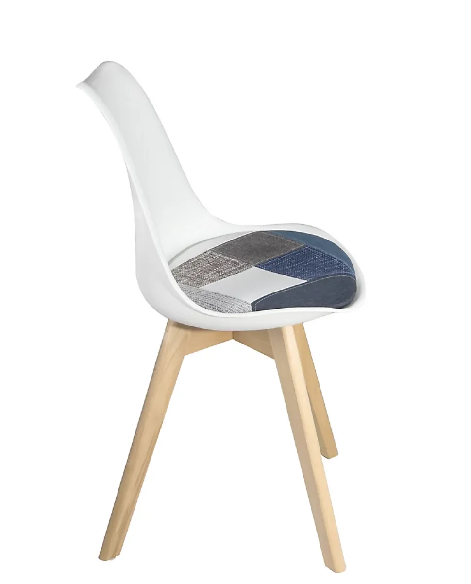 Style patchwork scandinave : chaise de cuisine lao avec coussins en patch coloré, combinant originalité et design scandinave, idéale pour toutes les pièces.