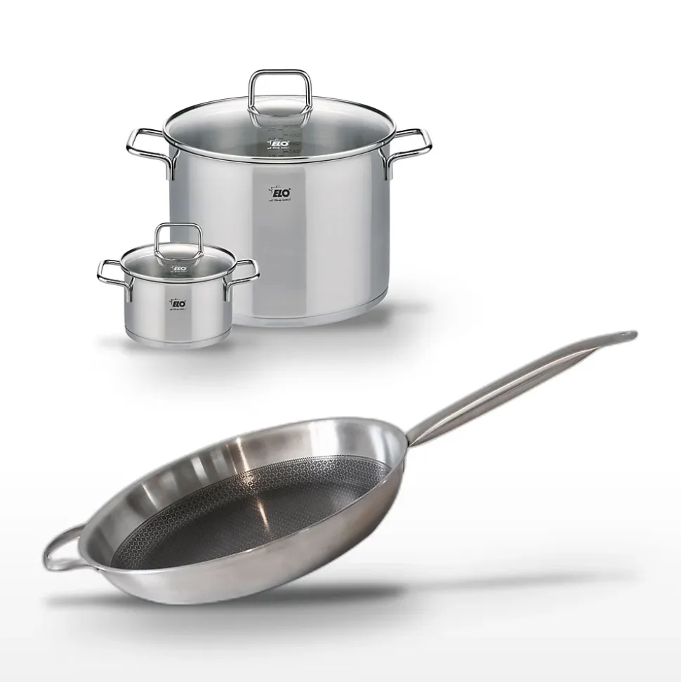 - DESCRIPTION: L’ensemble Elo Relief Solution inclut deux faitouts et une poêle en acier inoxydable, offrant une cuisson homogène et une grande résistance. Compatible tous feux, y compris induction.