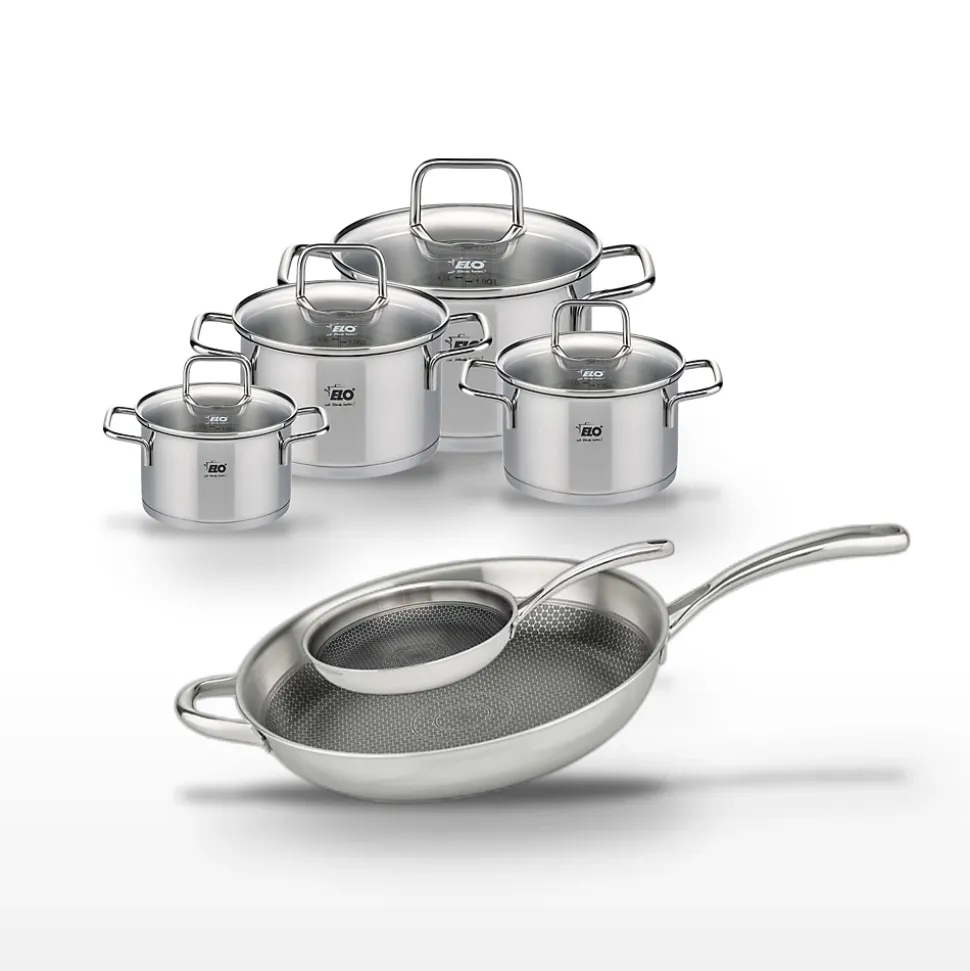 - DESCRIPTION: Ensemble de 2 poêles et 4 faitouts en inox, conçu pour une cuisson homogène et saine. Les poêles Elo Relief Evolution offrent un revêtement antiadhésif performant.
