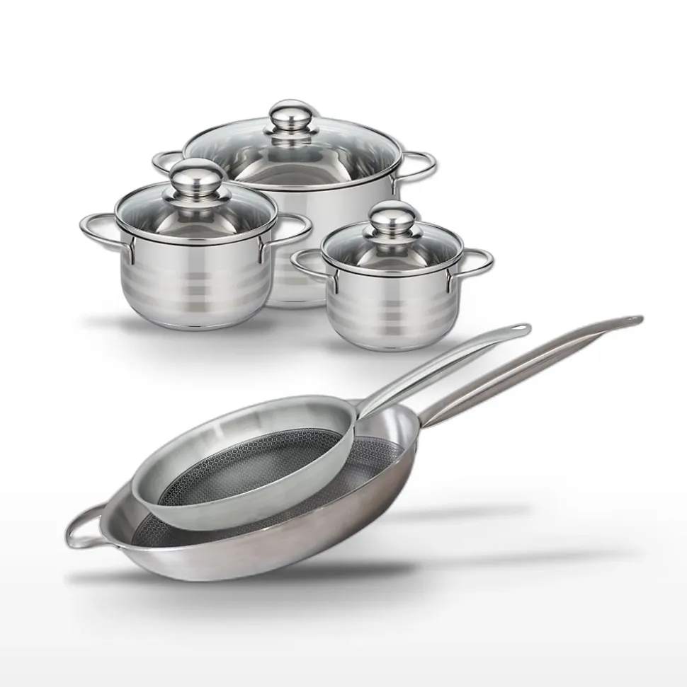 - DESCRIPTION : Ensemble de poêles et faitouts en acier inoxydable Elo Relief Solution, pour une cuisson homogène et saine.