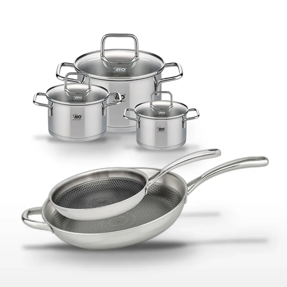 DESCRIPTION : DESCRIPTION : Ensemble Elo Relief Evolution avec poêles 28 et 32 cm et faitouts 12, 14, 20 cm. Cuisson homogène et saine.PETIT + : PETIT + : Revêtement ELODUR Professional sans PFAS pour une cuisson saine et sans attache.COMPOSITION : COMPOSITION : Acier inoxydable 18/10 pour poêles, acier inoxydable et verre pour faitouts.DIMENSIONS : DIMENSIONS : Poêles 28 cm et 32 cm, faitouts 12 cm, 14 cm, 20 cm.UTILISATION : UTILISATION : Compatible tous feux, y compris induction et four. Idéal pour saisir et mijoter.ENTRETIEN : ENTRETIEN : Lavable au lave-vaisselle. Poêles à nettoyer à la main pour préserver le revêtement.L’ensemble Elo Relief Evolution est conçu pour répondre aux exigences des professionnels de la cuisine. Les poêles de 28 cm et 32 cm, avec leur structure Triply, assurent une répartition uniforme de la chaleur, idéale pour saisir les aliments à haute température. Le revêtement antiadhésif ELODUR Professional garantit une cuisson saine, sans que les aliments n’attachent, et résiste aux rayures grâce à son fond en relief. Les faitouts de 12 cm, 14 cm, et 20 cm sont parfaits pour mijoter des plats en sauce, avec un fond capsulé qui préserve les vitamines des aliments. Chaque pièce est compatible avec tous les types de feux, y compris l’induction, et est conçue pour faciliter le nettoyage. Elo, marque allemande reconnue, offre avec cet ensemble une qualité supérieure et une durabilité assurée, répondant aux attentes des cuisiniers les plus exigeants.