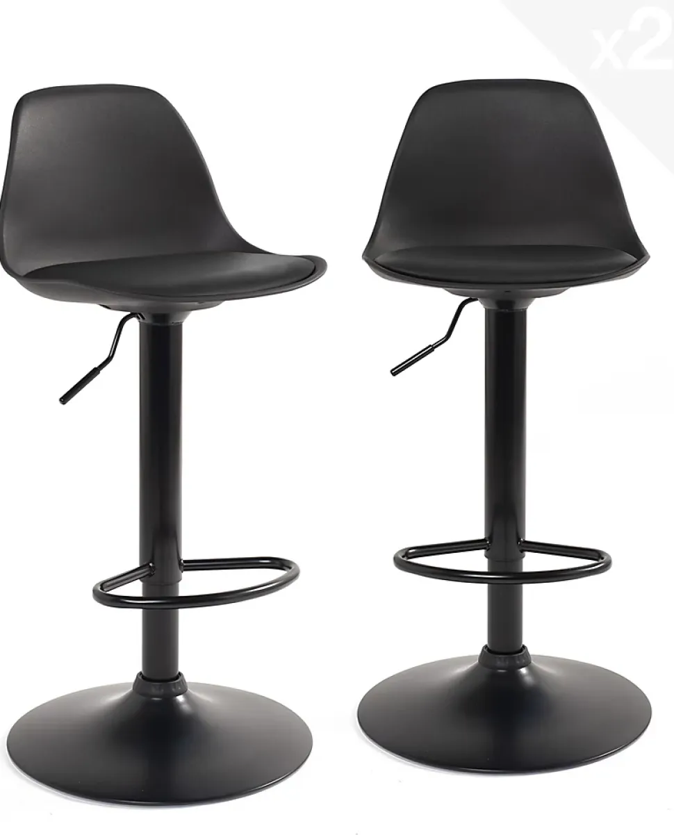 Ce lot de 2 tabourets sig possède une ligne élégante et un siège compact équipé d’un petit coussin fixe en simili cuir rembourré en mousse pour un style design et un confort au top derrière un bar ou un îlot de cuisine contemporaine. Très fonctionnel, il convient à toutes les hauteurs de plan de travail, de cuisine ou de bar. Le sig est réglable en hauteur, pivotant, son pied est monté sur une base ronde avec un joint anti dérapant et un repose pied intégré. Avec son siège compact c’est un tabouret adapté aux petites et moyenne morphologies (taille s / m -l). matières : – coque en polypropylène, assise rembourrée couverte de simili cuir (polyuréthane) – pied en métal avec pompe à gaz à levier p – base de diamètre 38,5 cm avec bande silicone anti dérapant – repose pieds soudés. – réglage hauteur par manette qui actionne un vérin pneumatique (pompe à gaz) – montage facile par une personne. Dimensions : 41 x 41 x 80/102 cm hauteur d’assise : mini : 60cm / maxi : 82cmentretien : chiffon sec sur les parties métal, chiffon humide sur la partie assise. Ne pas utiliser de détergents ou matières abrasives poids brut : 12,8 kg pour le lot de 2 poids net : 6 kg pour 1 tabouret