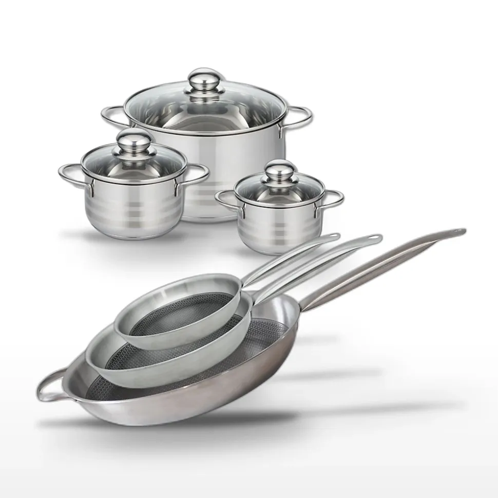 - DESCRIPTION: Ensemble de poêles et faitouts en acier inoxydable Elo pour une cuisson homogène et performante. Design moderne et fonctionnalité optimale.