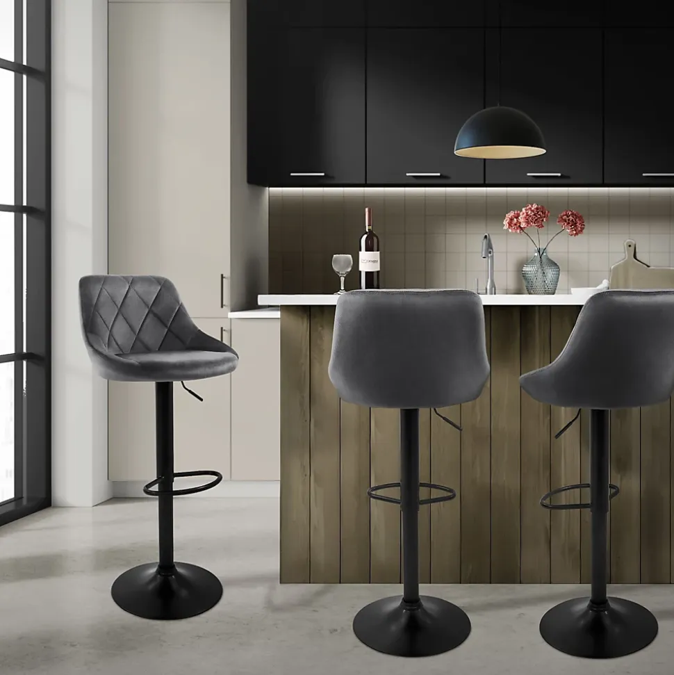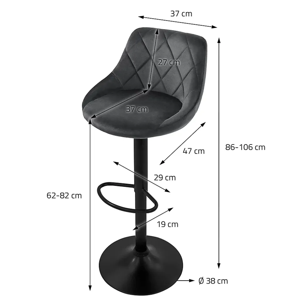 Description du produit:Améliore ton confort d’assise avec notre tabouret de bar réglable en velours – une touche de luxe pour ton bar ou ta cuisine !Tu souhaites avoir chez toi un siège qui soit non seulement élégant, mais qui offre aussi un confort maximal ? Notre tabouret de bar en velours réglable est la réponse à tes souhaits – une fusion d’élégance, de fonctionnalité et de commodité.Pourquoi notre tabouret de bar en velours est-il un must absolu ?Un luxe de velours: le revêtement exclusif en velours confère à ce tabouret de bar non seulement un aspect luxueux, mais aussi une sensation d’assise incroyablement douce et agréable. Chaque moment passé sur ce tabouret devient une expérience de pur confort.Hauteur d’assise réglable: adapte la hauteur d’assise à tes besoins ! Avec une hauteur réglable entre 62 et 82 cm, ce tabouret de bar offre une flexibilité maximale. Que ce soit au bar de la maison, au comptoir de la cuisine ou dans un lounge confortable, trouve ta position assise idéale.Caractéristiques:Lot de 4 tabourets de bar avec assise rembourréerepose-pieds et dossier court, ergonomique et confortableRevêtement en velours douxAssise confortable, indéformableMotif en losangeAssiette de pied et structure en métal revêtu par poudreRembourrage en éponge haute densité, doux et résistantFinition exquiseRéglable en hauteurLivraison:4 x tabourets de bar de ML-DesignInformations techniques:Matériau de l’assise : veloursMatériau de la structure : métal revêtu par poudreCouleur de l’assise : grisCouleur du piètement : noirHauteur d’assise : env. 62 à 82 cmHauteur totale : env. 86 à 106 cmProfondeur d’assise : env. 37 cmProfondeur totale : env. 47 cmLargeur de l’assise : env. 37 cmHauteur du dossier : env. 27 cmDiamètre du pied : env. 38 cmRepose-pieds (LxP) : env. 29 x 19 cmCharge maximale. Capacité de charge : env. 120 kgPoids : env. 11 kg