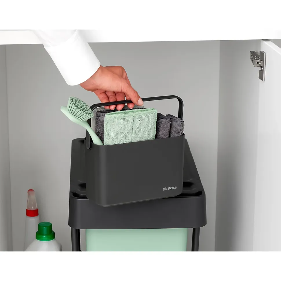 Cet ensemble de nettoyage Brabantia contient tout ce dont vous avez besoin pour commencer : brosse à vaisselle, raclette, 3 éponges en microfibres et 2 chiffons de nettoyage en microfibres ; le tout contenu dans un caddie de rangement astucieux. Le caddie est doté d’un séparateur mobile et d’un plateau d’égouttage intérieur. Facile à transporter, sa poignée ergonomique sert également de portant pour aérer et faire sécher les chiffons. Le set de chiffons de nettoyage (trois coloris) vous accompagnera lors de votre routine de nettoyage et permet de modérer l’utilisation de détergent ! La raclette est idéale pour gratter les résidus de nourriture alors que la brosse à vaisselle finira parfaitement le travail.