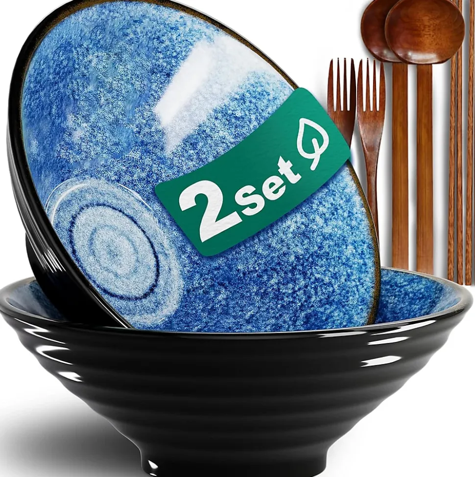 Ce lot comprend 2 grands bols à ramen en céramique de 1800 ml, accompagnés de 2 cuillères et fourchettes en bois ainsi que 2 paires de baguettes en bois massif . Chaque bol mesure 23,8 cm de diamètre et 9,5 cm de hauteur, offrant une capacité généreuse pour les repas quotidiens ou familiaux. Fabriqués en céramique de haute qualité cuite à haute température, avec une finition sous glaçure et un motif unique, ces bols allient élégance et durabilité. La bordure antidérapante filetée horizontale et la conception anti-brûlure en forme de cône assurent confort et sécurité. Polyvalents, ils conviennent pour les ramen, pâtes, salades, soupes, desserts, porridges, smoothies et bien plus. Compatibles micro-ondes, lave-vaisselle, four et réfrigérateur, ces bols combinent style, robustesse et praticité.