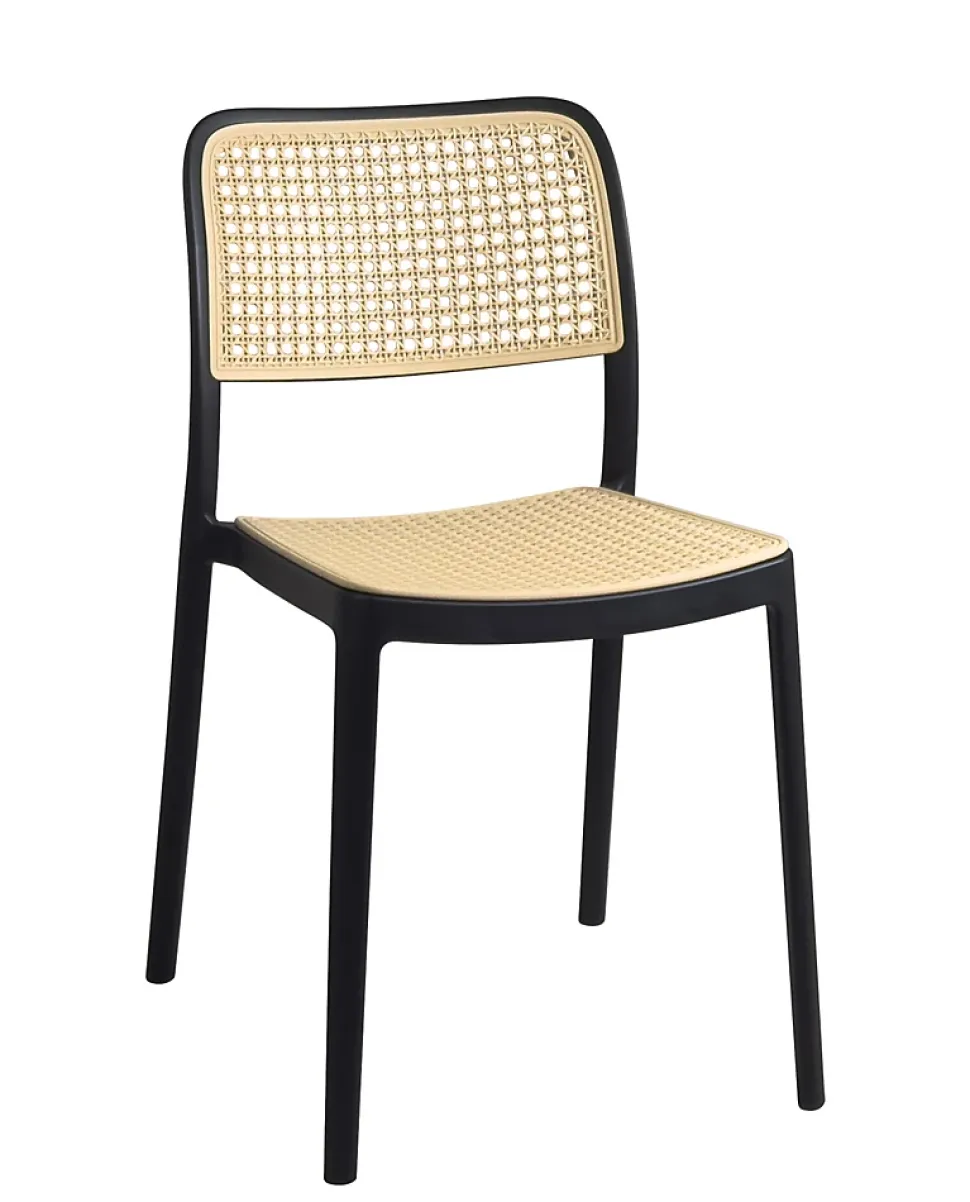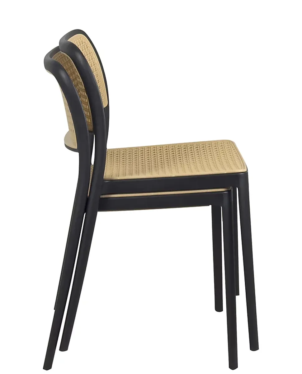 Apportez une touche rétro chic à votre intérieur avec ce lot de deux chaises noir et beige empilables. Mariant le style du rotin classique à la solidité d’une structure en plastique renforcé, ces chaises sont parfaites pour la cuisine, la salle à manger ou un restaurant tendance. Leur design ajouré offre confort et légèreté, tout en assurant une excellente durabilité au quotidien.✔ Ces chaises s’empilent facilement, un vrai plus pour les espaces restreints ou les établissements professionnels. Quand chaque mètre carré compte, elles offrent une solution pratique sans compromettre le style.✔ Profitez du charme du rotin naturel sans les inconvénients ! Leur assise et dossier ajourés en imitation rotin ajoutent une touche bohème et légère, parfaite pour une ambiance chaleureuse et conviviale.✔ Cuisine, salon, salle à manger ou même restaurant : leur design universel s’adapte partout. Leur ligne sobre et élégante en fait un choix idéal pour tout type de déco, du contemporain au rétro.✔ Fabriquées en plastique haute qualité, ces chaises résistent aux chocs, aux taches et au temps. Un choix fiable pour une utilisation quotidienne, aussi bien en usage domestique que professionnel.✔ Faciles à déplacer, elles sont légères sans compromettre leur stabilité. Leur structure noire mate offre une belle présence visuelle, tout en garantissant un confort solide à chaque assise.Matières :chaise en PP (Polypropylène)insert dossier et assise en imitation rotinépaisseur piètement : 3 cmpatins plastique transparent anti rayures (Protège vos sols)Fiche technique :dimensions hors tout : 47 (L) x 55 (P) x 81 (H) cmhauteur totale : +/- 81 cmhauteur d’assise : +/- 46 cmassise : 41 (L) x 44 (P) cmdossier : 44 (L) x 39 (H) cmcolisage : livré en 1 colis de 60 (L) x 50 (P) x 88 (H) cmnombre de pièces par carton : 2poids brut : 10.70 kgpoids net d’une chaise : 4.40 kg