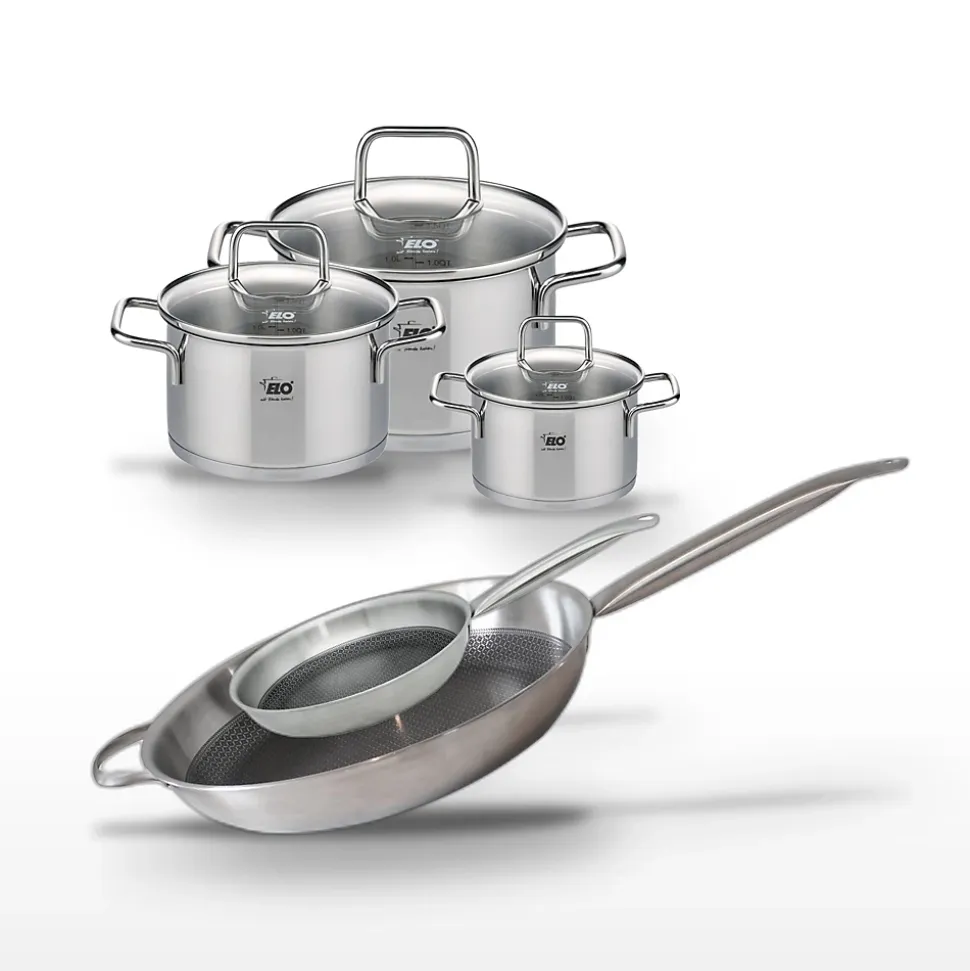 DESCRIPTION : Lot Elo Relief Solution comprenant deux poêles et trois faitouts en acier inoxydable de haute qualité, pour une cuisson optimale.PETIT + : Revêtement antiadhésif ELODUR Select, design moderne avec bord verseur et manche creux pour un confort maximal.COMPOSITION : Acier inoxydable 18/10, aluminium, revêtement antiadhésif sans PFAS, verre pour les couvercles des faitouts.DIMENSIONS : Poêles Ø 32 cm et Ø 24 cm, faitouts 20 cm, 16 cm, 12 cm, parfaits pour toutes vos préparations culinaires.UTILISATION : Compatible tous feux, y compris induction, et passe au four jusqu’à 240°C. Idéal pour cuisiner pour toute la famille.ENTRETIEN : Facile à nettoyer grâce au revêtement antiadhésif, passe au lave-vaisselle pour un entretien simplifié.L’ensemble Elo Relief Solution est un choix parfait pour les professionnels de la cuisine et les amateurs exigeants. Les poêles de 32 cm et 24 cm, avec leur revêtement antiadhésif ELODUR Select, assurent une cuisson sans accrocs et un nettoyage aisé. Les faitouts de 20 cm, 16 cm et 12 cm, en acier inoxydable, sont idéaux pour préparer divers plats, des sauces aux légumes mijotés. Chaque pièce est conçue pour une distribution homogène de la chaleur, compatible avec tous les types de feux, y compris l’induction, et résiste à des températures allant jusqu’à 240°C au four. Le design élégant et fonctionnel, avec bord verseur et manche creux, offre un confort d’utilisation inégalé. Ce lot est un investissement judicieux pour toute cuisine professionnelle, assurant durabilité et performance.