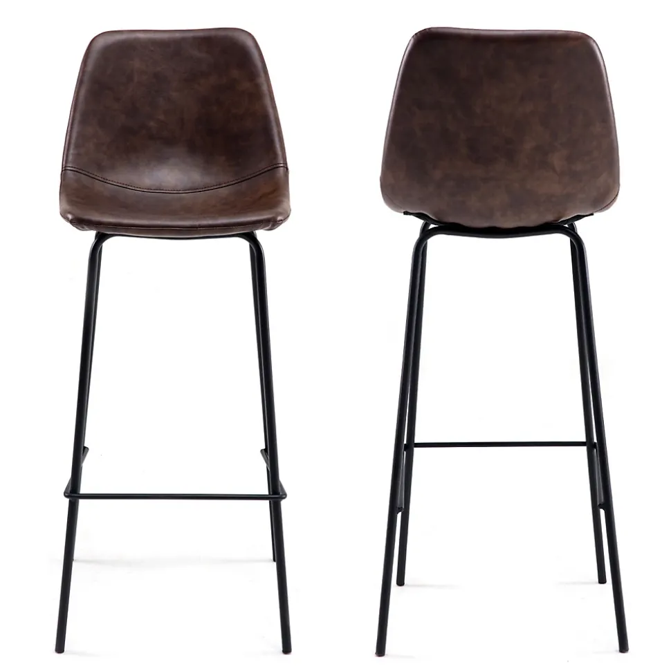 Style rétro chaleureux : Le revêtement en simili associé à une structure en métal noir confère un charme vintage authentique à ce duo de tabourets., Confort durable et bien pensé : Grâce à une large assise enveloppante et un repose-pieds intégré, ces tabourets offrent un confort optimal pour les moments prolongés au bar ou à la table haute., Solidité fiable : Grâce à une structure métallique robuste, chaque tabouret supporte jusqu’à 130 kg pour un usage fiable au quotidien.