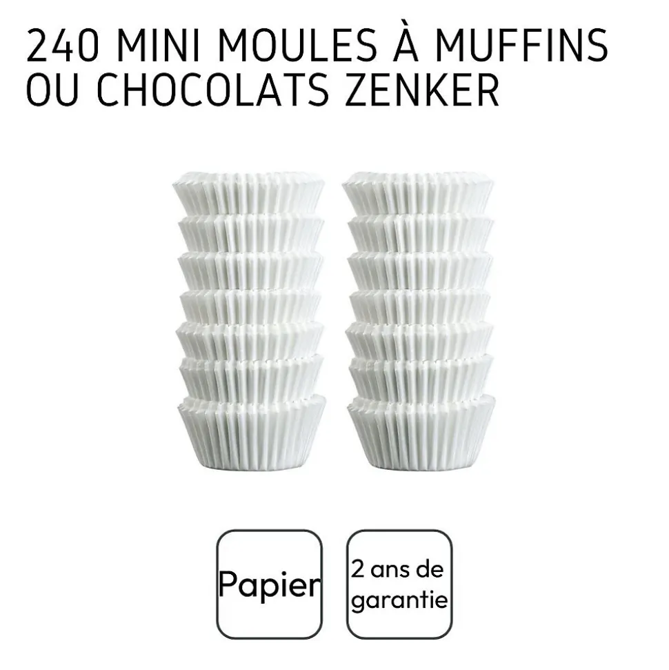 DESCRIPTION : Ensemble de 240 moules à muffin ou à chocolat en papier blancLE PETIT + : Avec ces moules à muffins vous pouvez réaliser des muffins aux pommes et autres gâteaux mais aussi vous en servir pour y mettre des chocolatsCOMPOSITION : PapierDIMENSIONS : 3 cm de diamètreCONTENU : 240 moules à muffin en papier de 3 cmLe muffin peut être anglais et dans ce cas il s’agit d’un petit pain brioché avec lequel on peut faire des hamburgers. Ou bien il peut être américain et dans ce cas il s’agit d’un petit gâteau rond et bombé. C’est ce type de muffin que vous pouvez cuire dans nos moules à muffins en papier. Le muffin peut être aux pépites de chocolat, aux myrtilles, aux pommes, au chocolat, nature, etc.Zenker est une marque faisant partie du groupe Fackelmann Brands et elle propose une large gamme d’ustensiles de pâtisserie et de moules à gâteaux. Concernant les ustensiles de pâtisserie, Zenker frappe fort en mettant à disposition des ustensiles de préparation mais aussi de décoration pour les pâtissiers confirmés. Côté moules à gâteaux c’est une marque pionnière qui propose des innovations telles que les moules à gâteaux en silicone et fibre de verre ne nécessitant pas de matière grasse et proposant des résultats de cuisson incroyables.Zenker possède donc une large gamme d’accessoires et d’ustensiles pour vous accompagner dans vos recettes du quotidien mais aussi pour des évènements exceptionnels comme les fêtes, les anniversaires, les mariages, etc.