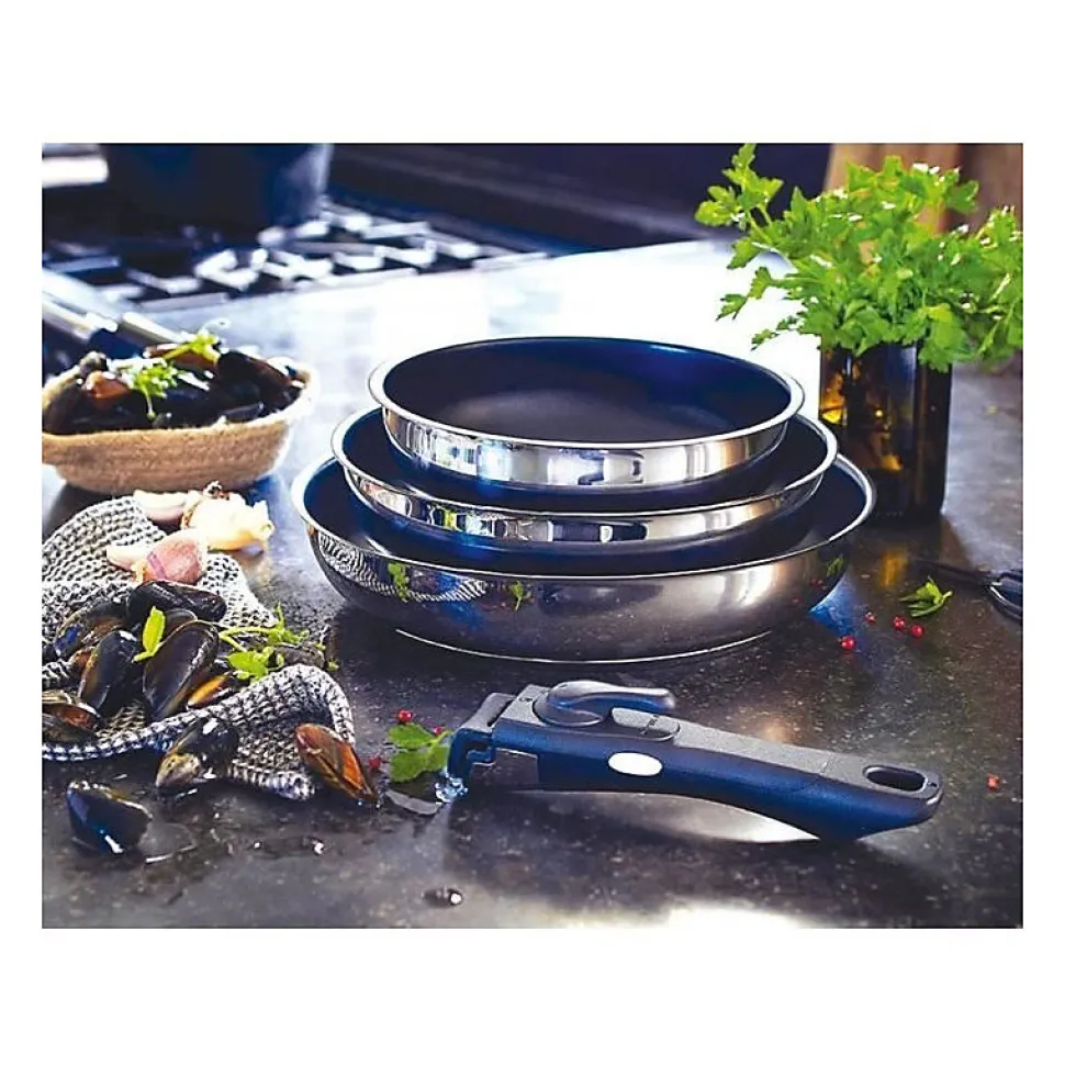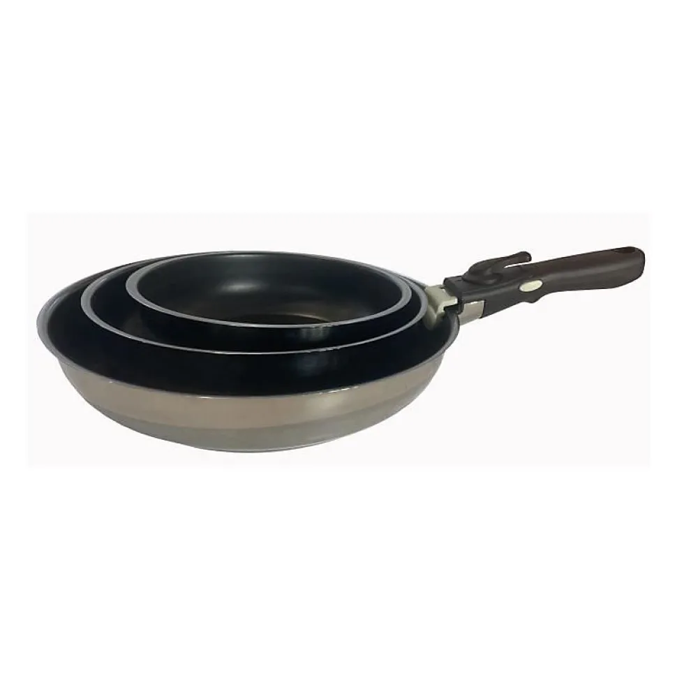 - Lot de 3 poêles en acier inoxydable avec manches amovibles pour un rangement facile et une utilisation au four.