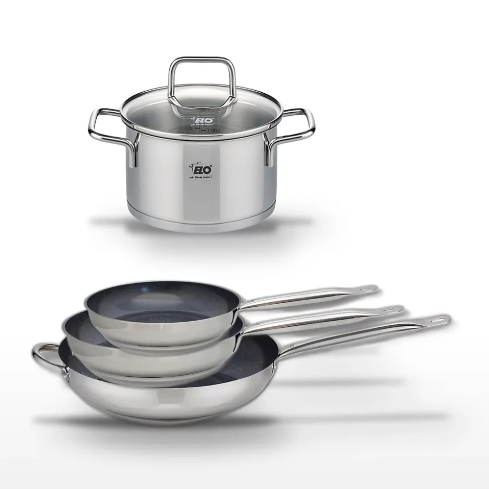 - DESCRIPTION: L’ensemble Elo Profi Therm Platinum offre trois poêles céramique sans PFAS et un faitout en inox, idéals pour une cuisine saine.