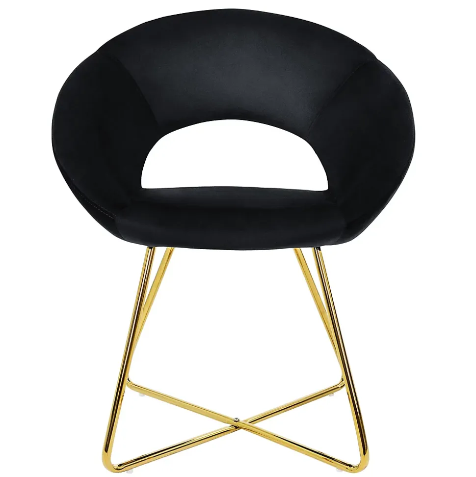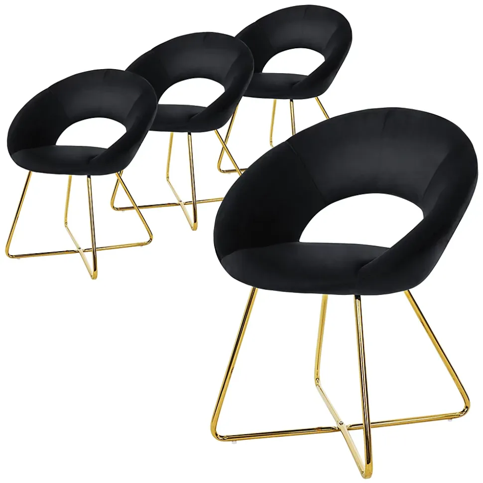 Description du produit:Découvrez l’alliance ultime de l’élégance et du design contemporain avec notre chaise de salle à manger à la structure métallique dorée et à l’assise en velours. Nous associons des matériaux de qualité à un dossier en demi-coque accueillant pour ajouter une touche de sophistication à votre salle à manger.Le fauteuil en velours est un complément polyvalent et attrayant. Fabriqué en velours rembourré, il est doté de pieds en fer dorés. La combinaison du velours et de l’or est la plus intéressante de la saison : un must absolu. Le fauteuil a des lignes douces et un rembourrage qui assure un confort d’assise maximal. Renouvelez votre salon avec ce fauteuil ou placez-le dans votre bureau pour une touche d’élégance.Notre structure en métal doré n’est pas seulement synonyme de stabilité et de durabilité, elle met également le fauteuil en scène de manière glamour. La couleur dorée s’intègre harmonieusement dans différents styles d’intérieur, du moderne au classique.Le revêtement velouté de l’assise procure une sensation de douceur et de confort incomparable. La texture noble du velours confère à la chaise une touche de luxe et en fait le point central de votre salle à manger. L’assise généreusement dimensionnée garantit un confort optimal, que ce soit lors de longs repas ou de réunions conviviales.Livraison:4 x Chaise de salle à manger de ML-DesignInformation technique:Matériau de la housse : veloursCouleur de la housse : noirMatériau du piètement : métalCouleur du piètement : orHauteur d’assise : 45 cmProfondeur d’assise : 39 cmHauteur du dossier : 36 cmLongueur du dossier : 50 cmLongueur x largeur x hauteur : 64 cm x 53 cm x 77 cmÉpaisseur des pieds : 1,6 cmCapacité maximale de charge : 120 kgPoids : 5,8 kg / pièce