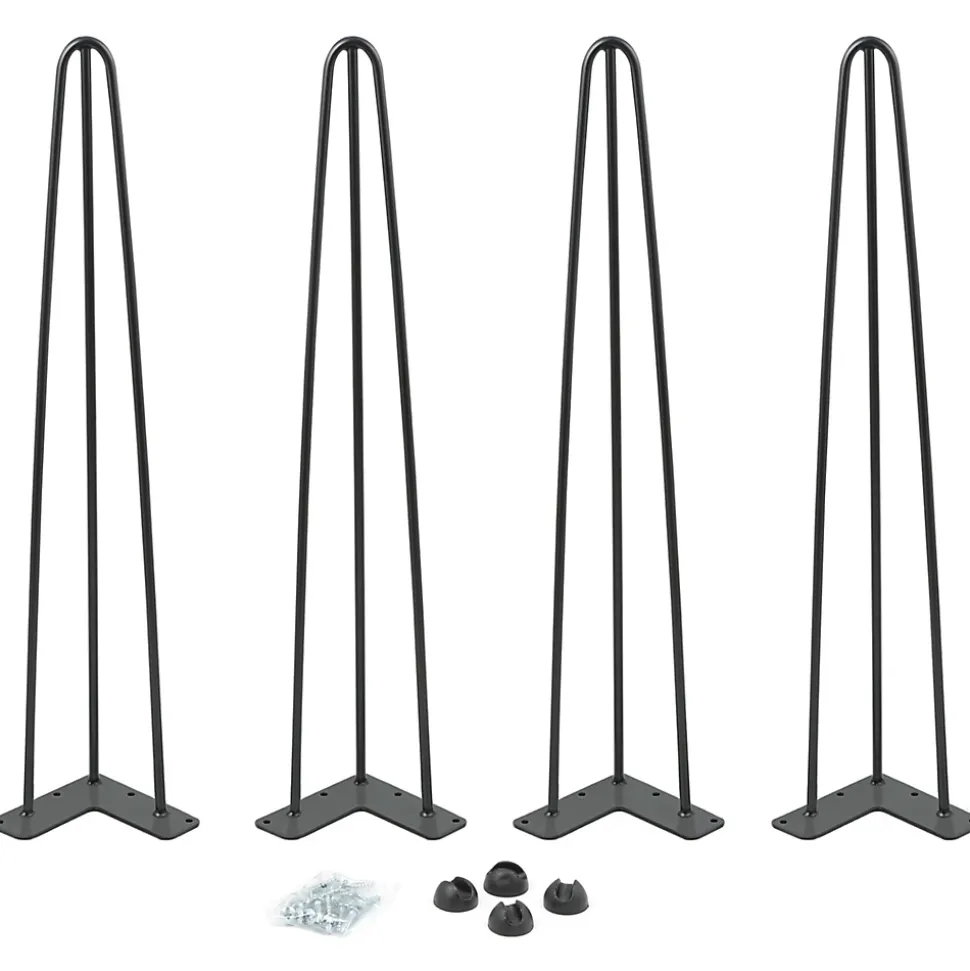 Laissez libre cours à votre créativité et fabriquez vous-même vos propres meubles tendances !Grâce à ce lot de 4 pieds épingle en acier laminé ultra robuste Hauteur 71 cm, customisez et réinventez vos vieux meubles. Ce set de 4 pieds apportera une nouvelle vie à votre console d’appoint, votre commode, avec un design industriel moderne ultra-tendance.Faites de votre meuble un objet unique et personnalisé ! C’est désormais facile de fabriquer votre propre table de salle à manger, vos tabourets de bar ou encore votre bureau. Leur design 3 tiges en forme de L leur confère stabilité et robustesse. Chaque pied supporte jusqu’à 50 kg environ.Montage facile : grâce à la plaque de fixation, les pieds se fixent simplement au plateau du meuble (non fourni) : 4 vis fournies par pied soit 16 vis au total.Dimensions du lot de 4 pieds épingle 71 cmHauteur d’un pied : 70,5 cm (avec patin 71 cm)Largeur d’un pied : 11 cmProfondeur d’un pied : 11 cmDiamètre : 1 cmDonnez du style à votre intérieur !4 Patins anti-dérapants fournisRéalisez tous vos projets sur mesure avec notre set de 4 pieds 3 branches en acier disponible sur notre boutique en ligne :- Lot de 4 pieds épingle 40,5 cm