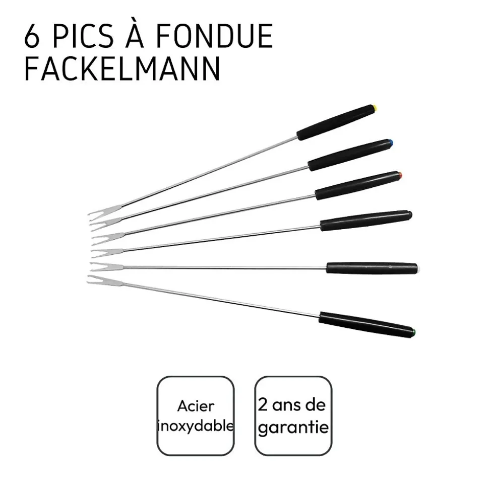 LE PETIT + : Ces piques à fondue bourguignonne ou savoyarde sont pratique pour accrocher un morceau de viande ou de pain et le tremper dans le vin ou le fromageCOMPOSITION : Acier inoxydable, plastiqueDIMENSIONS : 27 cmCONTENU : 6 pics à fondue savoyardeCe lot d’ustensiles de cuisine est composé de six fourchettes à fondue savoyarde ou à fondue bourguignonne avec des boules de couleur au bout du pique. Chaque pique à fondue mesure 27 cm de long et possède deux dents au bout afin de piquer le bout de viande, de poisson ou de pain que vous allez ensuite tremper dans le fromage, l’huile ou le bouillon.La fondue bourguignonne consiste à plonger de la viande et notamment du bœuf dans un bouillon d’huile chaude assaisonner souvent de vin et d’herbes aromatiques. Vous pouvez aussi plonger de la volaille et d’autres viandes et aliments.La fondue savoyarde est un peu différente puisqu’elle consiste à plonger du pain très dur dans un mélange de vin blanc et de quatre fromages savoyards avec de la crème ou d’autres assaisonnement selon votre recette.Ces piques à fondue sont donc parfaits à utiliser dans les deux cas, mais attention, ne perdez le bout de viande ou de pain dans le bol de bouillon sinon vous aurez un gage !Fackelmann France est une entreprise spécialisée dans la distribution d’ustensiles de cuisine et de pâtisserie ainsi que de moules à gâteaux et de plaques de cuisson. L’entreprise tente d’apporter une certaine facilité dans la façon de cuisiner de chacun grâce à ses ustensiles malins.Les ustensiles de cuisine de Fackelmann France sont proposés à tous les profils de cuisiniers pour une utilisation simple et quotidienne. Les fouets, spatules, louches, éplucheurs, planches à découper et bien d’autres sont à votre portée afin de préparer de délicieuses recettes toujours plus originales.
