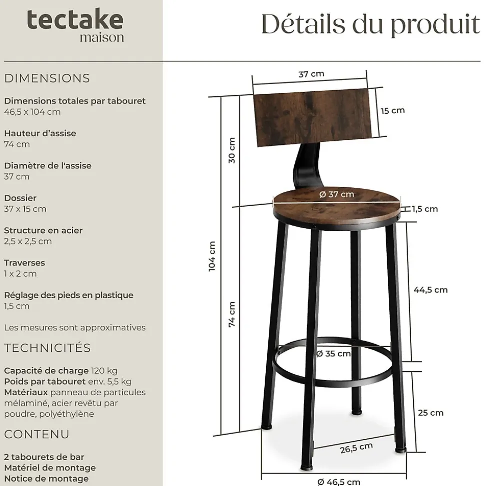 - Caractéristiques techniques:Dimensions totales de chaque tabouret (ØxH) : env. 46,5 x 104 cmHauteur d’assise: environ 74 cmDiamètre de la surface d’assise : env. 37 cmDossier (lxH) : env. 37 x 15 cmDistance entre les barres transversales inférieures et le sol : env. 25 cmÉpaisseur des panneaux de particules : env. 1,5 cmCadres en acier (lxP) : env. 2,5 x 2,5 cmBarres transversales (lxH) : env. 1 x 2 cmRéglage des pieds en plastique : env. 1,5 cmCapacité de charge par tabouret : 120 kgPoids de chaque tabouret : env. 5,4 kgMatériaux : panneau de particules, acier revêtu par poudre, polyéthylène