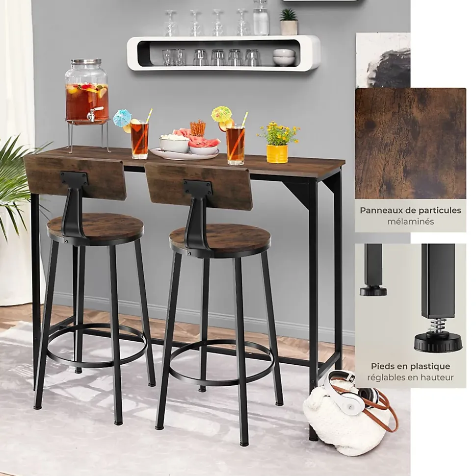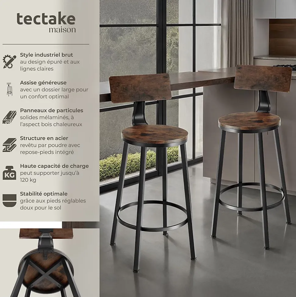 - Points Forts:Lot de 2 tabourets de bar à l’allure distinctive du style industrielGrands dossiers pour une position assise plus confortablePanneaux de particules robustes avec revêtement de protection en mélamineCadres en acier stables et robustes revêtus par poudreBarres transversales pratiques pour poser les piedsPieds en plastique réglables en hauteurFacile à nettoyerMontage rapide et facile