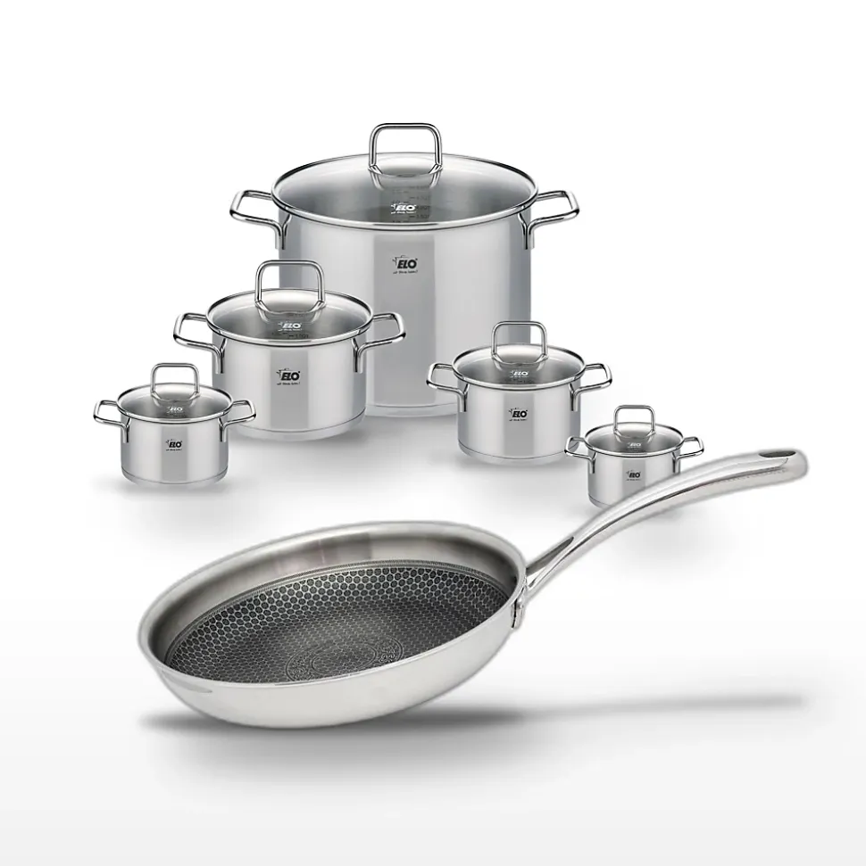- PETIT +: La poêle Elo Relief Evolution offre un revêtement sans PFAS pour une cuisson sans accrocs, tandis que les faitouts Elo Citrin préservent les vitamines grâce à leur fond capsulé.