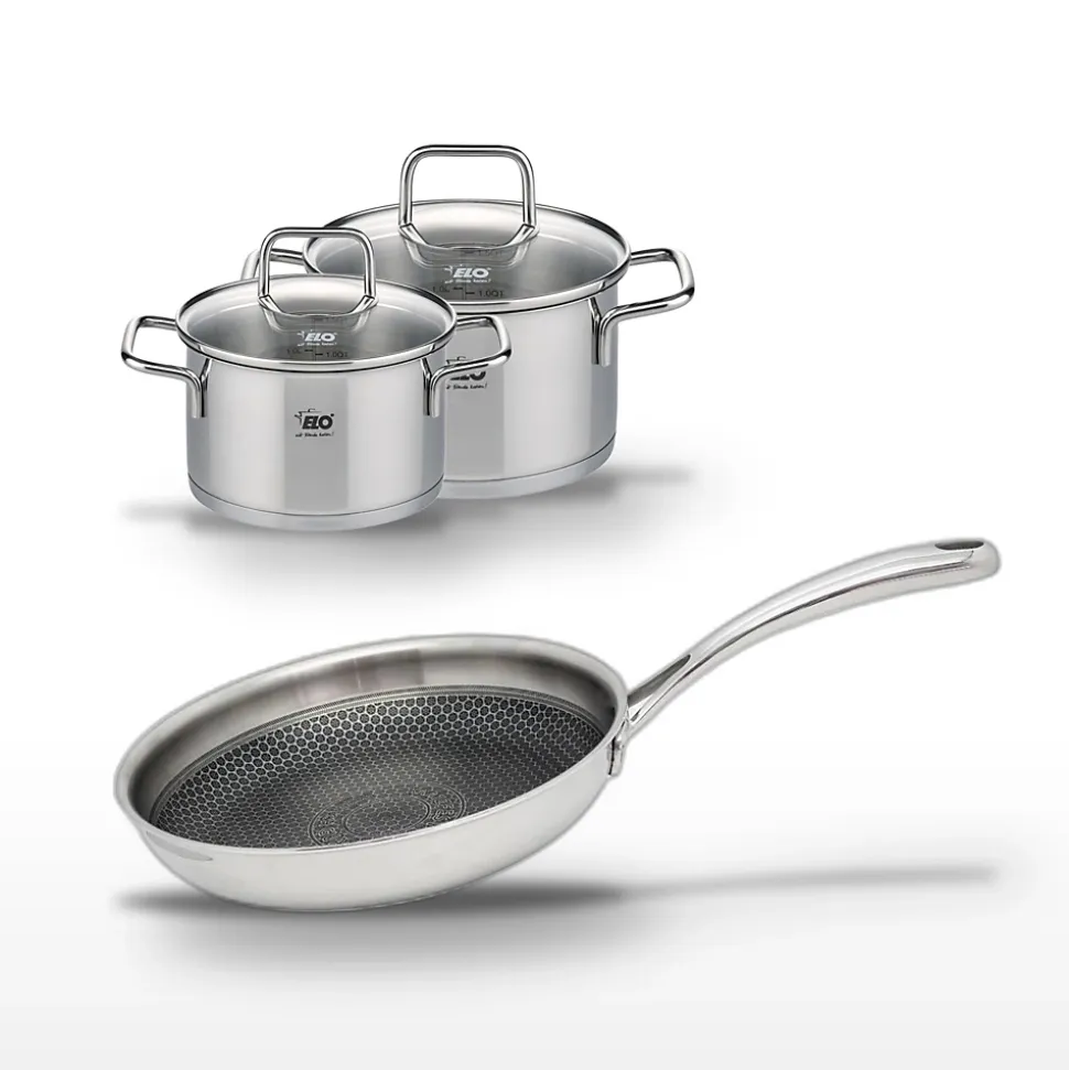 - DESCRIPTION: Ce lot Elo comprend une poêle 28 cm et deux faitouts de 14 cm et 12 cm. Idéal pour cuisiner sainement grâce au revêtement antiadhésif sans PFAS de la poêle et à l’acier inoxydable de haute qualité.