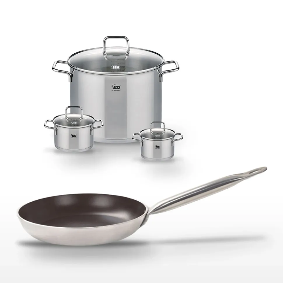 - DESCRIPTION : Cet ensemble Elo offre une poêle en céramique de 32 cm pour une cuisson sans PFAS et trois faitouts en inox idéaux pour toutes vos préparations culinaires