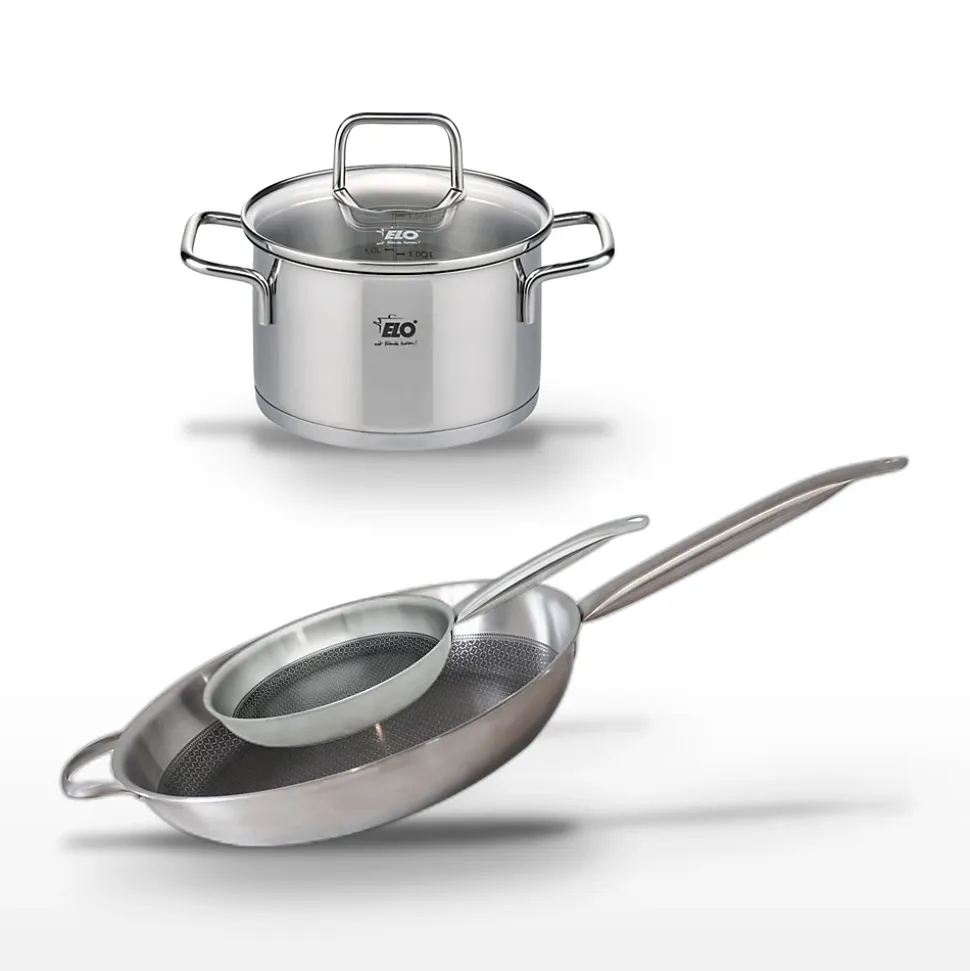 - DESCRIPTION: Lot comprenant deux poêles Elo Relief Solution (24 cm et 32 cm) et un faitout Elo Brillant de 12 cm. Matériaux de haute qualité pour une cuisson homogène.