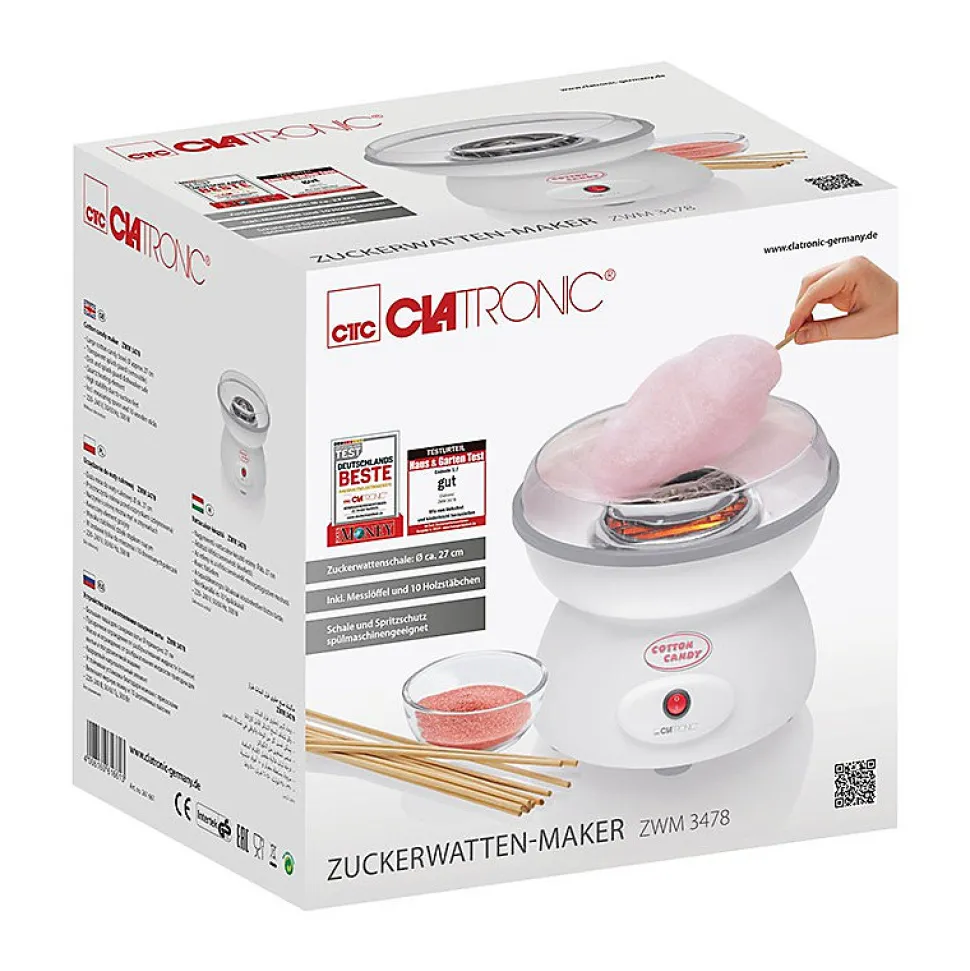 Grand bol à barbe à papa : Ø 27 cm environPare-éclaboussures transparent (amovible)Le plat et la protection contre les éclaboussures passent au lave-vaisselle.Élément chauffant à quartzSupport sûr grâce aux pieds à ventouseCuillère à mesurer et 10 bâtonnets en bois inclus220-240 V, 50/60 Hz, 500 W