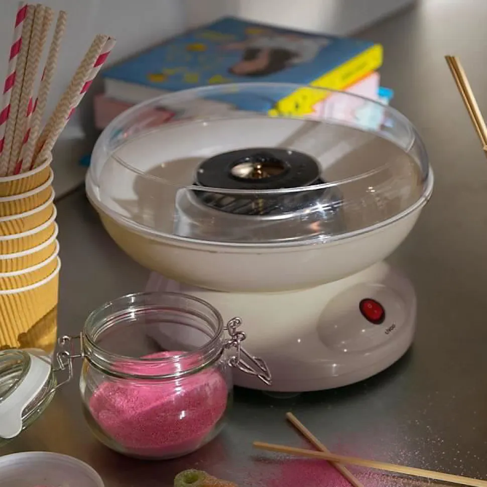 Machine à barbe à papa Livoo DOM468C 450 W — cuve amovible ø26,5 cm, cuillère doseuse compatible lave-vaisselle et 10 sticks en bambou inclus. Design bicolore noir et crème, pieds antidérapants, interrupteur ON/OFF en façade. Garantie 2 ans.