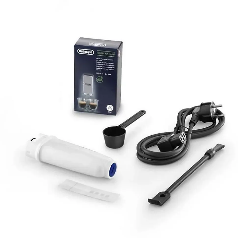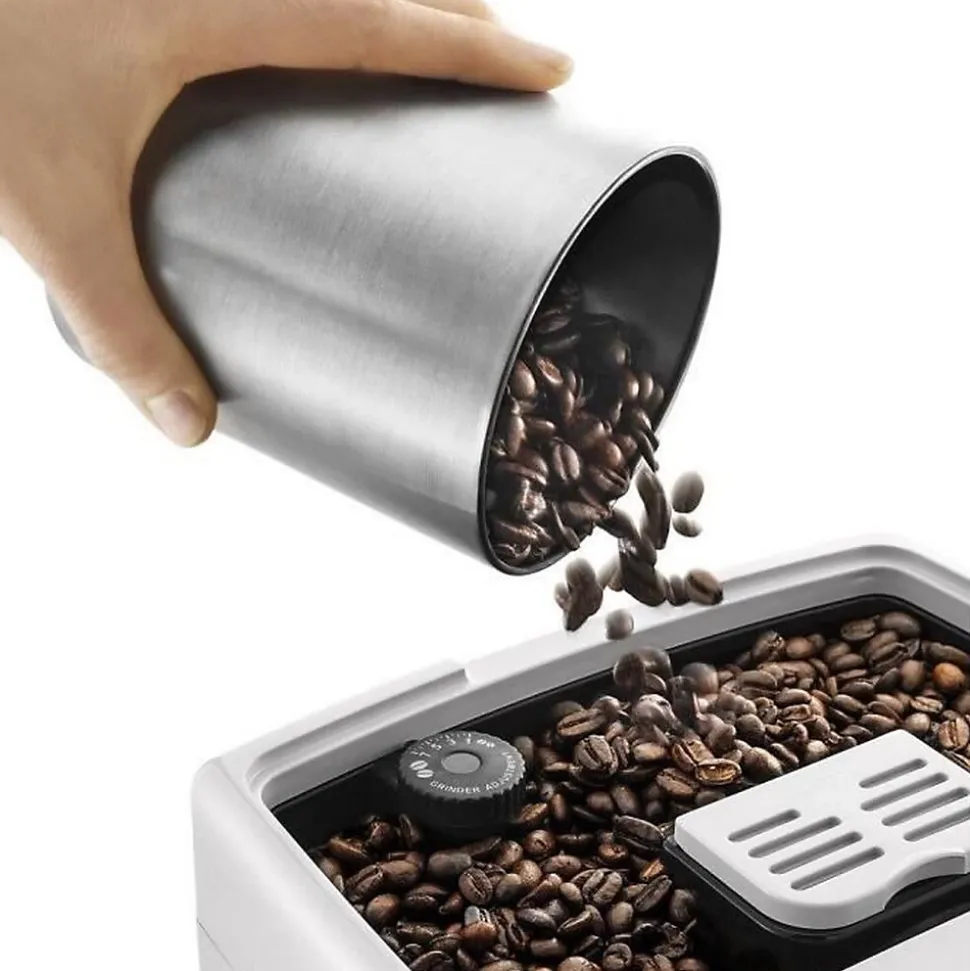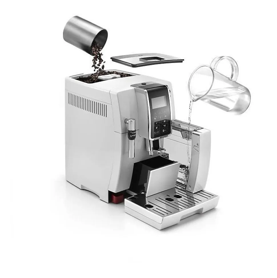 De’Longhi Dinamica ECAM 350.35.W : machine expresso automatique avec broyeur intégré et écran tactile, 4 recettes en accès direct, réservoir grains 300 g, réservoir eau 1,8 L, pression 15 bar, finition glossy white avec accents chrome. Système Thermoblock, pré-infusion, moulin réglable, buse vapeur inox pour cappuccino, double sortie réglable (84–135 mm). Facile d’entretien avec programmes de rinçage et détartrage, filtre à eau inclus.
