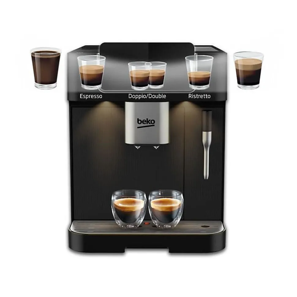 Machine à café automatique BEKO CEG7302B avec broyeur intégré (1350 W, 19 bars). Réservoir d’eau 2 L, conteneur à grains 250 g, écran tactile et 5 options de boissons (Expresso, Americano, Lungo, Ristretto, Doppio). Inclut carafe à lait 0,6 L, buse vapeur latérale, double sortie café, bec ajustable en hauteur, plateau chauffe-tasse, éclairage de la zone de distribution et entretien simplifié (rinçage automatique, parties compatibles lave-vaisselle). Garantie 2 ans.