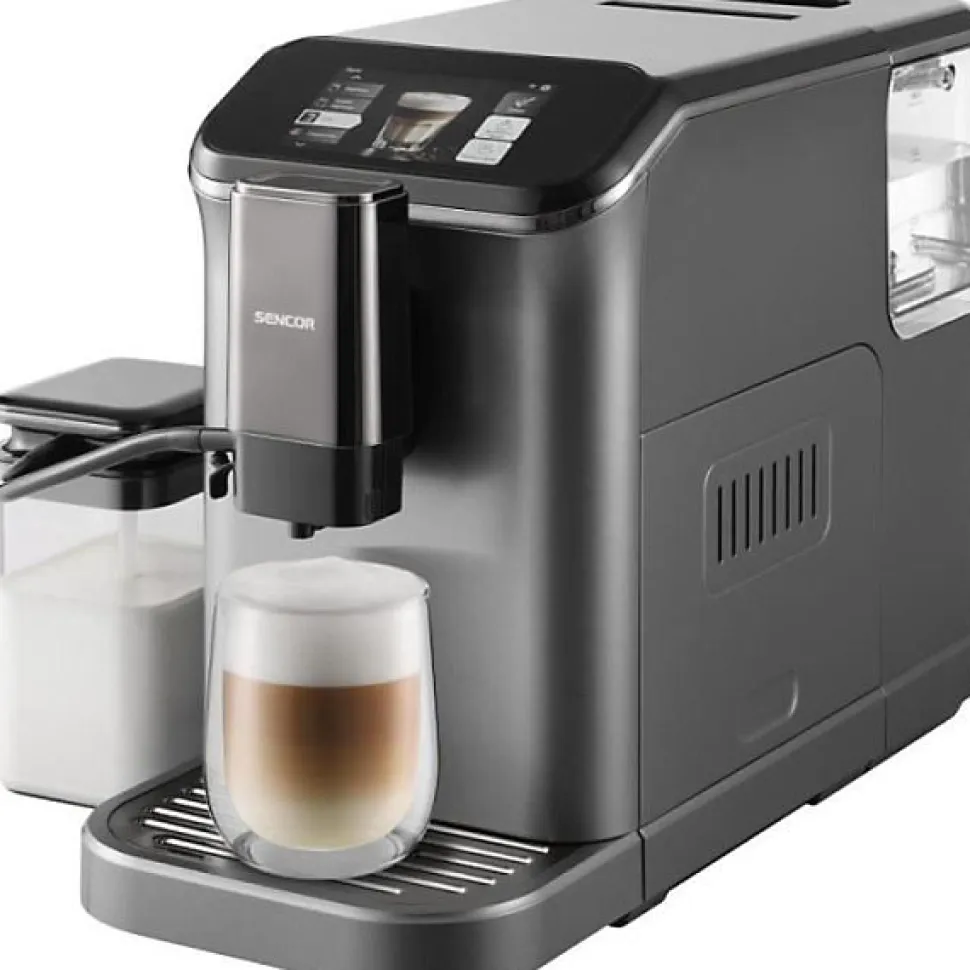 Machine à expresso entièrement automatique Sencor SES 8500BK avec écran TFT, pompe 20 bars, broyeur inox 15 niveaux, réservoir d’eau 1,5 L et réservoir lait 750 ml. Prépare espressos, lungo, cappuccino et latte d’une touche, contrôle via application Wi‑Fi, entretien simplifié avec unités amovibles et programmes d’auto‑nettoyage.