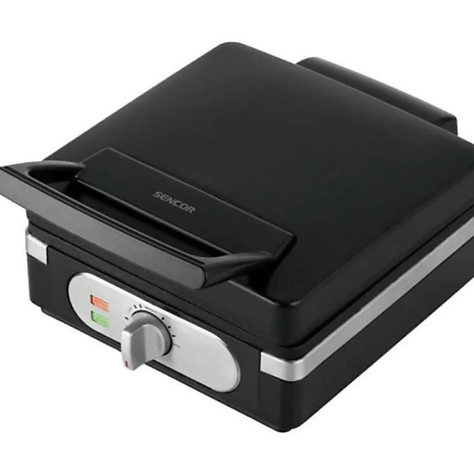 Gaufrier Sencor SWF 2010BK 1400 W noir — prépare 2 gaufres (85 x 145 mm) avec des plaques antiadhésives, thermostat réglable, voyants de cuisson, poignée isolée, fusible thermique et rangement vertical. Compact et facile à entretenir.