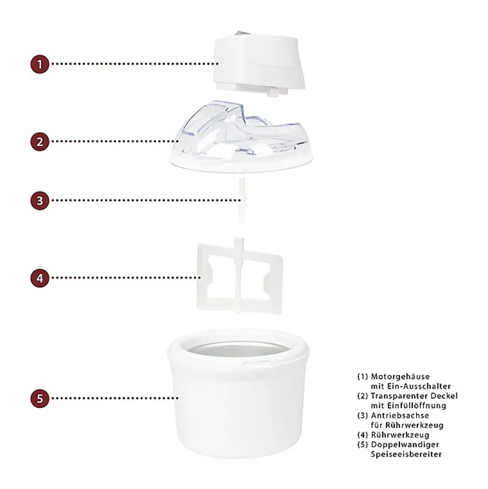 Sorbetière pour la préparation de sorbets, de glaces et de yaourts glacés.Sorbetière à double paroi avec réservoir de froid (H : 13,8 cm ; Ø 20 cm)Couvercle transparent avec ouverture de remplissagePour jusqu’à 1500 ml de crème glacéeTemps de préparation (crème glacée) : 20-40 min.Boîtier du mélangeur et du moteur amovible pour un nettoyage facileSuggestions de recettes inclusesSupport sûr grâce aux pieds caoutchoutés220-240 V, 50 Hz, 12 W