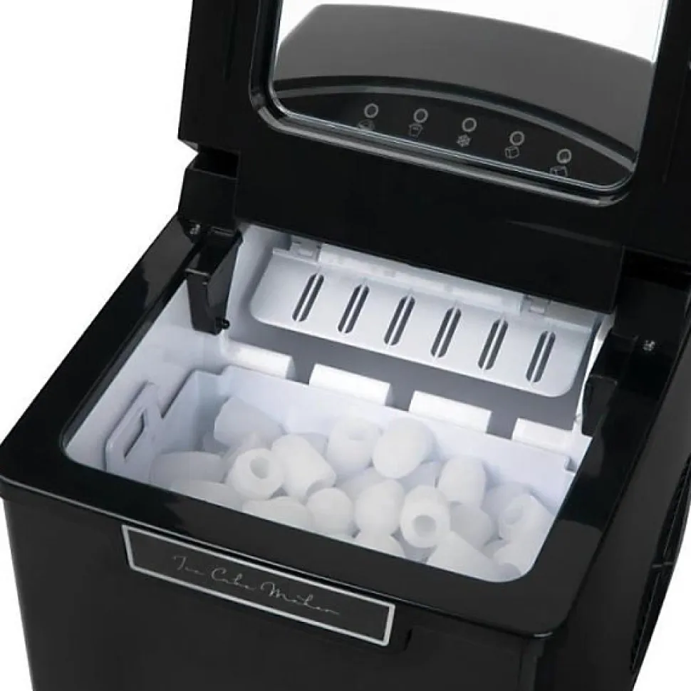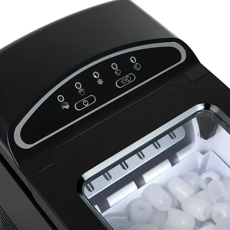 Machine à glaçons compacte Sencor SIM 3000BK noire : produit jusqu’à 12 kg/jour, glaçons prêts en 9 minutes, réservoir 1,9 L avec arrêt automatique, fonctionnement silencieux, panneau LED, compacte et portable — idéale pour maison, camping, bateau et fêtes.
