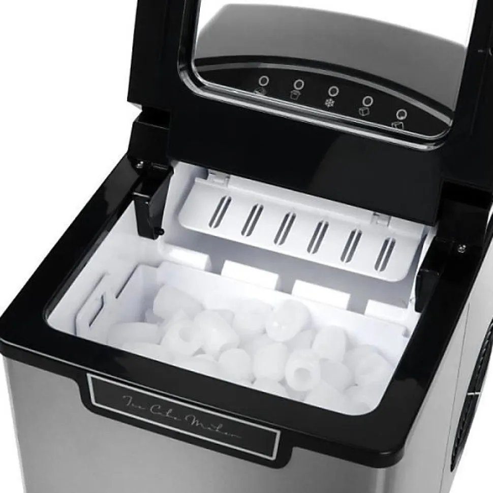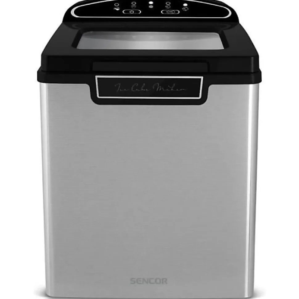 Machine à glaçons compacte Sencor SIM 3500SS : produit jusqu’à 12 kg/jour, glaçons prêts en 9 minutes, réservoir 1,9 L, deux tailles de glaçons, arrêt automatique et fonctionnement silencieux. Idéale pour fêtes, camping, bateau ou petite cuisine.