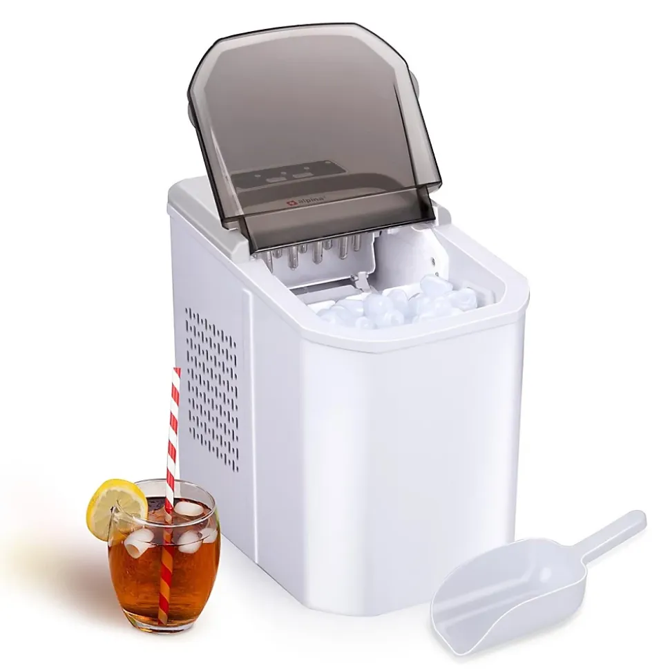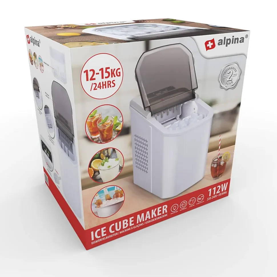 Machine à glaçons 112W ALPINA. Puissance: 112W. Capacité: 12-15kg/24 heures. Capacité en eau: 1,25L. 9 glaçons par cycle en 10 à 12 minutes. Différents formats de glaçons (S et L). Volume du bac à glace: 0,5 kg. Bac à glace amovible. Pelle à glaçons incluse. Alimentation électrique: 230V. Fréquence: 50-60Hz. Dimensions : 32 x 23.5 x 32.5 cm. Poids 7.3 kg.